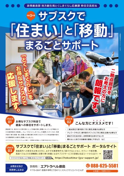 県外からの移住者にとって移動初期に課題となっている「移動にかかる経済負担」を軽減し、スムーズな「とくしまぐらし」を満喫いただくため、交通手段の「乗り放題・使い放題」を月額定額で利用できる「サブスク料金移動手段付きの賃貸物件」を県内に整備いたしました。