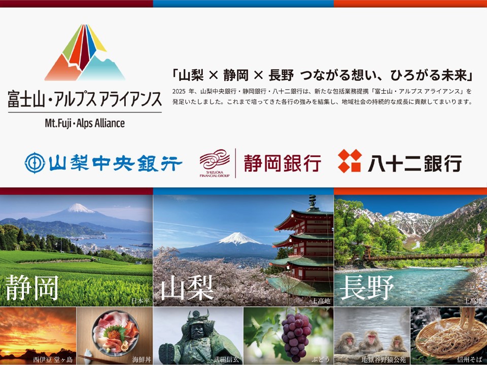 富士山・アルプス アライアンスは、静岡銀行・山梨中央銀行・八十二銀行の3行によるアライアンスです。静岡県・山梨県・長野県を中心に地域経済を支える3行が、移住される皆さまの新生活をサポートします!