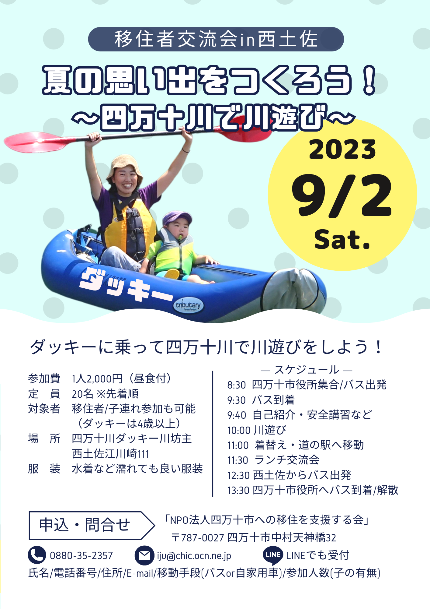9月2日(土)に四万十川で川遊び&交流会を開催します。 四万十市では年に4,5回、移住者交流会を開催しています。 移住希望者の方もお気軽にご参加ください。 移住の先輩や地元の方から話を聞くチャンスです。 今回、乗るのはカヌーではなく、ダッキー! ゴムボートのような安定性があり、カヌーのように漕げるイイトコ取り、それがダッキーです。 体験会社「四万十川ダッキーカヌーの川坊主」の谷夫妻も移住者。 ふるってご参加ください! ★参加条件★ 四万十市への移住を考えている方 四万十市への移住支援登録をされている方 ▼移住支援登録はこちらから https://www.city.shimanto.lg.jp/site/iju-teiju-subsite/5555.html ― スケジュール ― 8:30 四万十市役所集合/バス出発 9:30 バス到着 9:40 自己紹介・安全講習など 10:00 川遊び 11:00 着替え・道の駅へ移動 11:30 ランチ交流会 12:30 西土佐からバス出発 13:30 四万十市役所へバス到着/解散 ★お申込み・お問合せ★ 「NPO法人四万十市への移住を支援する会」 電話/0880-35-2357 メール/iju@chic.ocn.ne.jp たくさんのご参加、お待ちしております♫ ▼「四万十川ダッキーカヌーの川坊主」 https://www.kawaboze.com/ ▼谷夫妻の移住ストーリー https://pitamachi.com/municipality/topics/851
