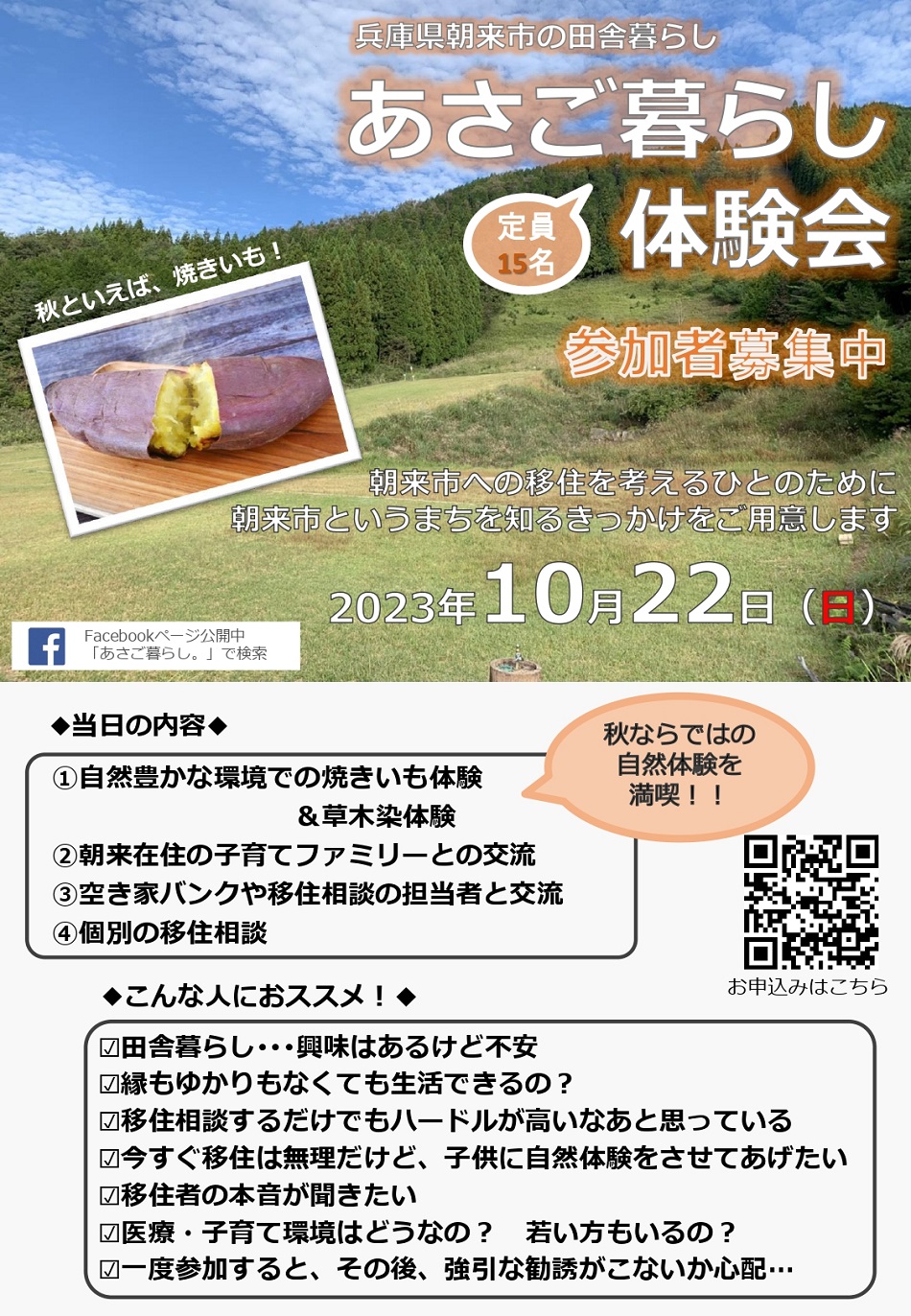 当日の内容 ◎焼きいも体験・草木染体験 焼きいもをしながら子どもたちは自然遊び、大人は草木染を体験しながら自然を存分に感じていただけます。 ◎朝来在住の子育てファミリーとの交流 すでに移住をして子育てをしている家族との交流を通して、朝来市での子育てのリアルを知っていただけます。 ◎空き家バンクや移住相談の担当者との交流 空き家バンクを通じて家を探す上で見逃してはいけないポイント、移住を考える上で大切にしたいことをお伝えします。 ◎移住相談会 移住を考える上で欠かせない仕事のこと、住まいのことを含めて、市の制度の説明も対応します。