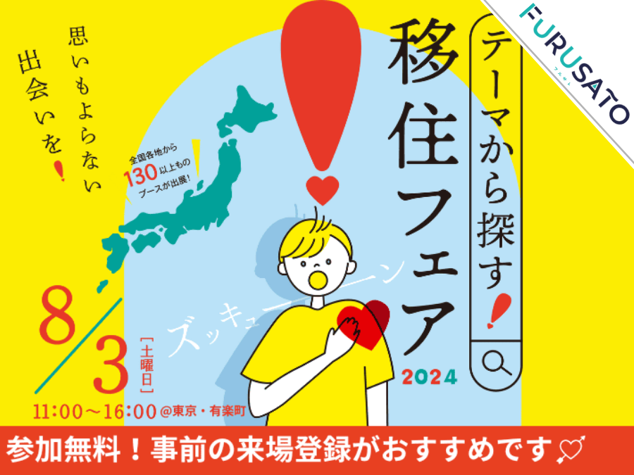 日本には1718の市町村があります。 その中から、「自分の理想の暮らしができる地域」を探すのは大変。 その中から、「自分たちの地域に興味を持ってもらう」のは大変。 じゃあ、お互いの 「こんな暮らしがしたい!」「こんな暮らしができるよ!」 から繋がりませんか? そんな、地域名からではなく、できることから探すイベントを開催します。 ーーーーーーーーーー♡ ♥日時: 2024年8月3日(土) 11:00~16:00 ♥場所: 東京交通会館12階ダイヤモンドホール+カトレアサロンAB (東京・有楽町) 東京都千代田区有楽町2-10-1 ♥参加費:無料 ーーーーーーーーーー♡ 北海道~沖縄まで、133ブースが出展! 移住するぞ!って人だけでなくても大歓迎です。 移住ってどんなことができるの?どんな地域がどんなことやっているの? と軽い気持ちでぜひお越しください。 今年は、ゆっくり地域の方と話せるブースや、イベント、キッズコーナー、プレゼント等も用意しています。 ぜひ、思いもよらない出会いを作ってください! ーーー◤カテゴリ一覧◢ーーー 【🏠住まい】 古民家、温泉付きリゾマン、空き家バンクなど! 東京とは全然違う、住宅事情や補助金などの情報満載です。 【🌴島】 5年で1000人が移住した島や、釣り好きにはたまらない島も。 沖縄県は、就職や本島のブースも「島」カテゴリで出展します! 【👤ローカルヒーロー】 日本酒プロジェクトや、キッチンカー、地域のことならなんでも任せろ!という受入団体まで、地域の活躍する人に出会えます! 【∞地域と関わる】 能登の震災復興から、ふるさとワーホリ、阿波踊りまで!希望の関わり方を探すところから! 【👶子育て】 山ほいく、親子・山村留学、充実・びっくりの支援まで! 近くにキッズコーナーを用意しますので、ゆっくりご相談ください。 【ライフスタイル】 二拠点や、毎日温泉、アート、週末気軽にアウトドアなど、暮らしの質を高めたい方必見です。 【暮らしの環境】 あなたは 山派? 海派? 文化的な街並派? それとも利便性? 食や移住支援などもここで出展します。 【農林漁業】 オーガニック農業ならここ! フルーツ、多品種、北海道で牛飼いになりたい方や、林業まで。 自営だけでなく、就職やアルバイト、体験情報なども満載です!支援やサポートも手厚いです 【地域ならではの働き方】 様々なミッションの地域おこし協力隊や、マルチワーク、転職や起業、狩猟なども! (株)星野リゾート、北海道北見バス(株)も出展します。 【🗾都道府県】 都道府県のブースも出展します! (東京交通会館8階ふるさと回帰支援センターには、各県の相談員が常駐しています) 【マッチとタッチの、ブースマッチングコーナー】 地域が決まっていない方、やりたいことが決まっていない方、全国対応の移住相談員が、お話をお伺いしつつ、移住の基本情報や進め方、ブースや地域を提案します。 はじめての方はぜひ。