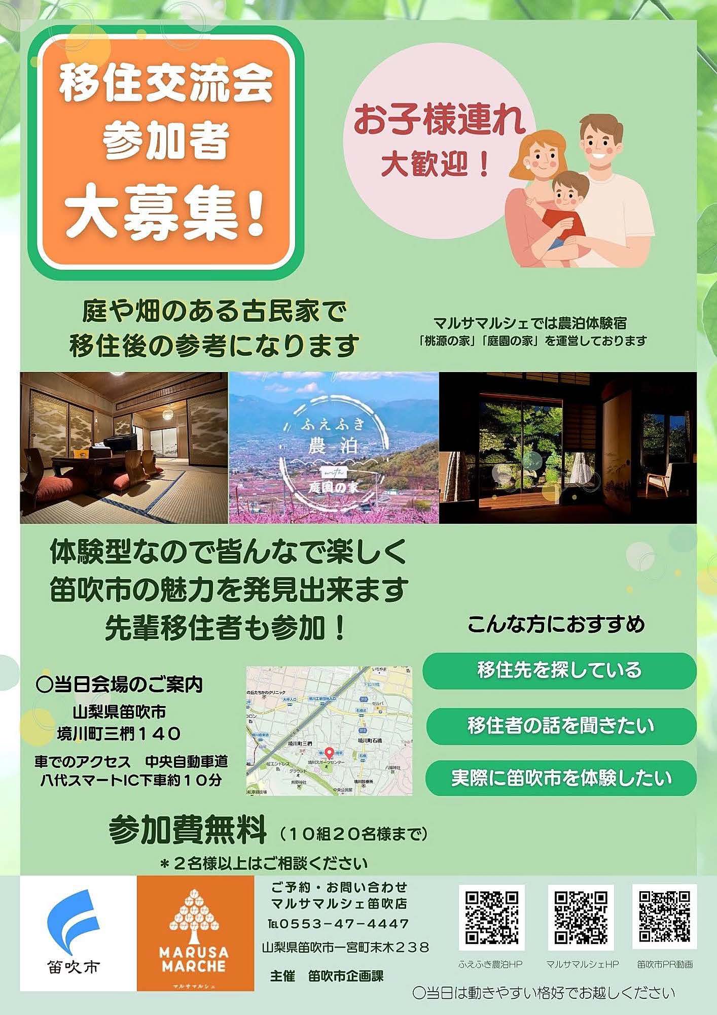 笛吹市に移住を検討されている方を対象に、全4回の「体験型移住交流イベント」を開催します! 笛吹市内にある古民家にて体験型ランチ・農体験・相談、交流会がお楽しみいただけます。 実際の先輩移住者にも参加いただきますので、移住に関するお悩みや笛吹市に住んでみての感想など リアルな意見を聞くことができます!!市役所職員も参加しますので支援制度などのご相談も可能です。 各回10組限定で参加費は無料となります。※1組2名様以上の場合は別途要相談。 イベント内容などは下記チラシをご覧ください。ご不明な点等ございましたらお気軽にお問い合わせください。