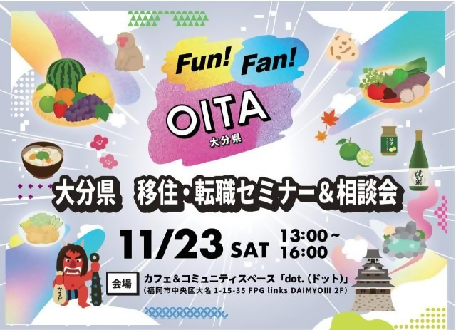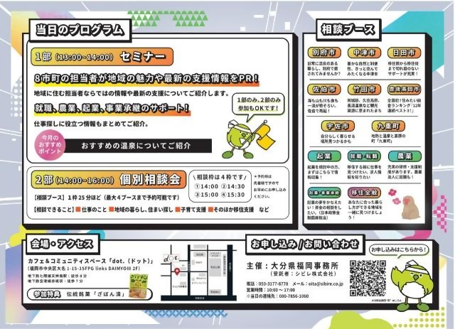 温泉のある暮らし、移住に興味をお持ちの方に向けセミナーと個別相談会が開催されます。 当日は大分県内の8市町の魅力や最新の支援情報や、おすすめの温泉についてもご紹介します。 竹田市も出展しますので、暮らし、住まい、仕事など気になっていることを聞いてみませんか! セミナーのみ、個別相談のみの参加もOKです。 お気軽にご参加ください。 〇日時 令和6年11月23日(土) セミナー13:00~14:00 個別相談会①14:00➁14:30③15:00④15:30 〇会場 カフェ&コミュニティスペース「dot.(ドット)」 (福岡市中央区大名1-15-35 FPG links DAIMYOⅢ 2F) ※牛かつ もと村さんの向かいビル2階