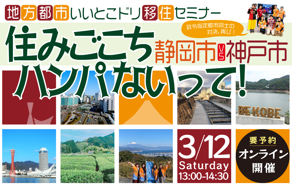 静岡市と神戸市、共に政令指定都市であり、大都市(東京・大阪)ともほどよい距離である2市。 ほどよく都会でほどよく自然、温暖な気候、食べ物が美味しい、Jリーグのサッカーチームの本拠地であるなど、様々な共通点のある2つの市が昨年に引き続きコラボセミナーを開催! 今回のセミナーでは、先輩移住者をお招きしてのクロストーク、現地からのライブ中継映像を交えて静岡市と神戸市の「リアル」な魅力をたっぷりお届けします!! ※新型コロナウイルス感染症の状況により、オンライン開催のみと変更となりました。 ※内容は変更となる可能性もあります。 詳細はこちらです。 https://www.furusatokaiki.net/seminar_detail/?event_id=376391