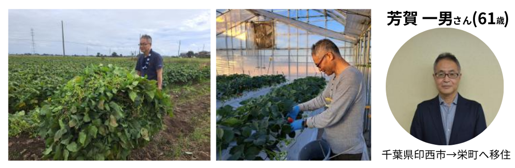 ーーーーー 芳賀 一男(はが かずお)隊員 ーーーーー ●栄町への移住の動機は? よく成田へ行く際などに栄町を通っており、気になっていました。 都心へ行くにも、商業施設へ行くにもアクセスがいいと感じていました。 ●移住してみてどうだった? 都心等へのアクセスがいいのに、自然が多くて良いです。 移住者だから、という目ではなく、人が優しいまちです。 ●今後の意気込み 栄町を多くの方に知ってもらうため、SNSによる情報発信、農産物の商品開発、販路拡大にチャレンジし、農業体験などを通して新たな地域コミュニティづくりを目指します! ●着任後の活動 2025年10月に着任し、10月から11月にかけて町内の2軒の農家で研修をさせていただきました。 1軒目では、どらまめ栽培の、収穫・選別・出荷まで、一連の作業を教えていただきました。 2軒目では、ネギの苗作りから販売まで、細やかな作業を教えていただきました。寒い時期の屋外作業は大変でしたが、それぞれの農家さんが努力や工夫を凝らしておいしい作物づくりに取り組んでいると感じました。 リバーサイドフェスティバルやドラムの里のイベントなど、多くの町のイベントにも参加しました。 12月から1月は、前半のネギ農家と後半のいちご農家で充実した活動となりました。 いちご農家では収穫作業に携わりましたが、完熟いちごは非常にデリケートで、細心の注意を要する繊細な作業でした。自然を相手にする農家の厳しさを実感する日々です。 農業研修のほかにも、12月には大鷲神社の酉の市に参加しました。 活動を通して、町民の皆さまのあたたかさを感じています。 今後も活動を通して、隊員ならではの目線で栄町の魅力を発信していきたいと思います。 今後も栄町で活躍するおふたりの地域おこし協力隊の活動に注目です!