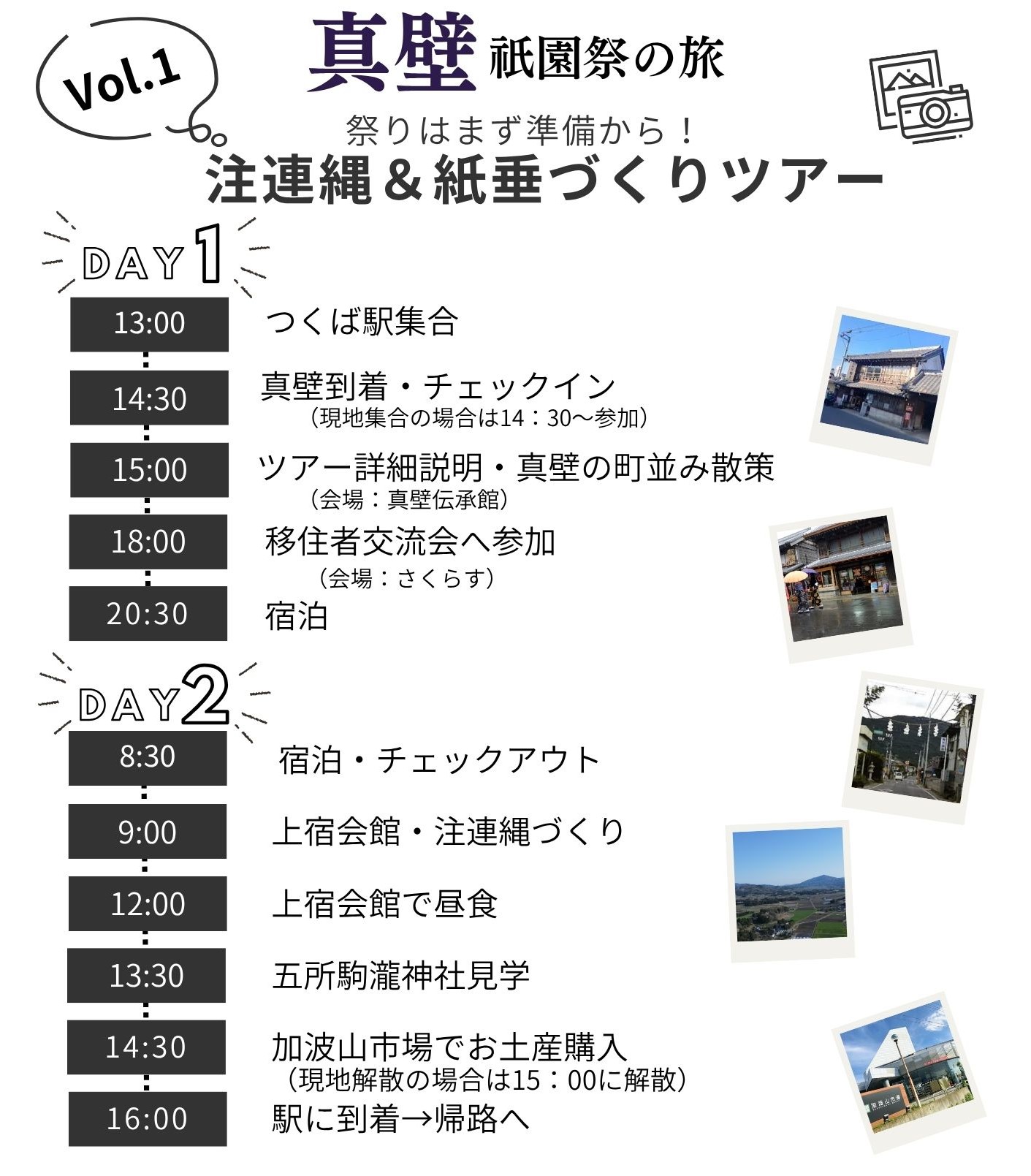 ■申し込み後の流れ 申し込みが完了しましたら、こちらでご希望の宿泊施設を仮予約いたします。 (申込の段階で希望の宿泊施設が満室の場合は、第二希望の施設をご予約いたします。) その後、ご本人様より宿泊施設へご連絡いただき、本予約とさせていただきます。 当日は、町並み散策がありますので、履きなれた靴でお越しください。 2日目のしめ縄づくりは、作業しやすい服装でご参加ください。 集合場所 ・つくばエクスプレス「つくば駅」 ・現地(真壁伝承館) 上記の2か所からお選びいただけます。 タイムスケジュールは下記の通りです。