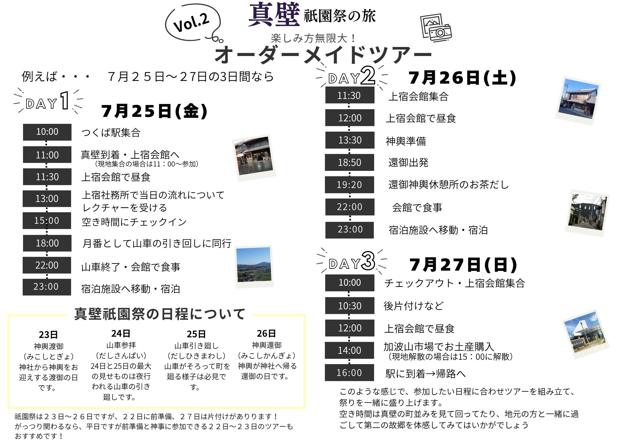 ■ツアーの開催の流れ 1.希望日を申し込む ↓ 2.祭り日程や町内の状況によりお手伝い内容を提案します。 宿泊施設の仮予約を行います。 ↓ 3.内容を確認していただき、宿泊施設へ本予約の連絡をご自身で入れていただきま す。 ↓ 4.つくば駅or現地に集合 ツアーに参加 集合場所 ・つくばエクスプレス「つくば駅」 ・現地(真壁伝承館) 上記の2か所からお選びいただけます。 真壁祇園祭の日程については http://www.kankou-sakuragawa.jp/page/page000031.html コチラをご確認ください。 タイムスケジュールをご都合に合わせて、下記のように組むことが出来ます。 不明な点等ありましたらお気軽にご相談ください。