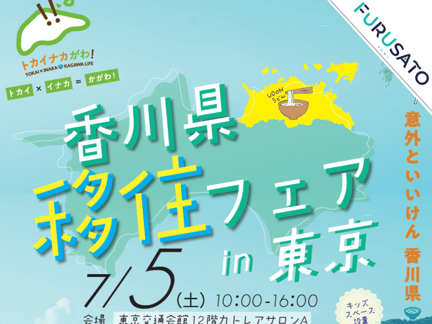今年も香川県の全17市町が出展する、「香川県フェアin東京」を開催します! 県内全市町の自治体担当者による「移住に関する相談」のほか、会社情報や求人に関する「就職相談」、また「就農相談」、「子育てに関する相談」、「住まいの相談」、「地域おこし応援隊」、「産業界」など各ブースがあります。 ゲストは、音楽プロデューサー&シンガーソングライターの福島節さんとその家族の渚さん、真希さん。 ミニコンサートでほのぼのした歌声を披露してもらいます。 さらに、関東圏から香川県に移住した先輩移住者2名も参加!移住体験談を語っていただきます! ーーーーーー \香川県 移住フェアin東京/ ーーーーーー ●日程: 2025年7月5日(土) 10:00~16:00 ●会場: 東京交通会館12階(東京・有楽町) カトレアサロンA ●参加費用:無料!事前に受付を行って頂くと、当日スムーズにご入場頂けます。 事前申し込み特典もあります! (※申込無しでも参加できます) ●詳細はこちら https://www.furusato-web.jp/event-info/p218938/ ーーーーーーーーーー 【スケジュール(予定)】 10:00~16:00 各出展団体で個別相談 10:30~10:45 セミナー① 移住コーディネーターによる香川県紹介 11:00~11:30 セミナー② 各市町のPR 13:00~14:00 セミナー③ 先輩移住者パネルディスカッション・クイズ (クイズの正解者には景品があります!) 14:30~15:00 セミナー④ 福島さんご家族による移住体験談+ミニコンサート
