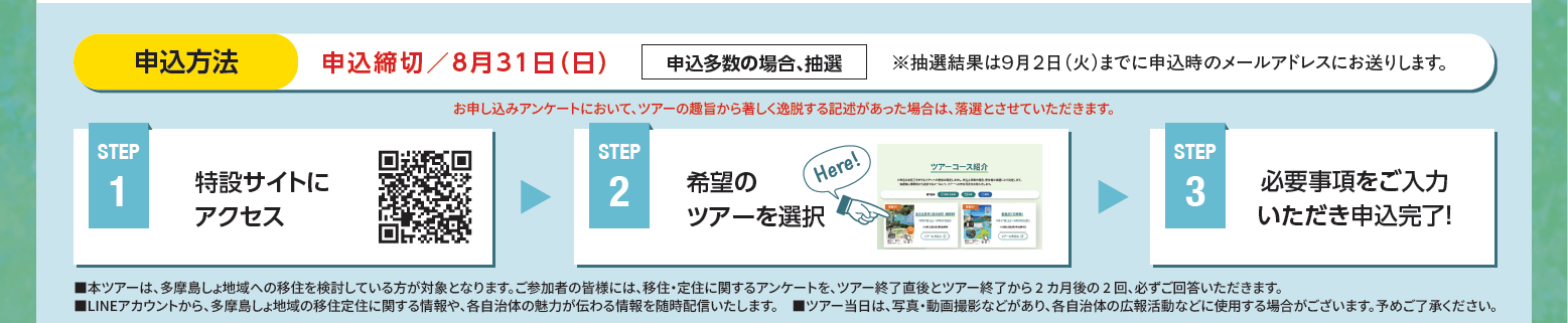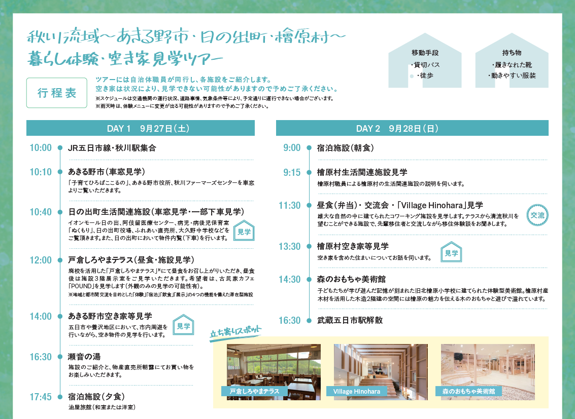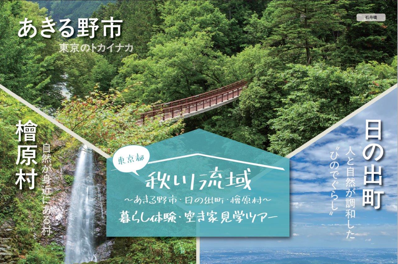 秋川の流域にある東京都あきる野市・日の出町・檜原村の3つの自治体を訪問し、暮らしの体験や空き家の見学を行うツアーです。 それぞれの地域を知り、移住後の生活をイメージしてみましょう! ▶各地域の詳細情報はこちらから あきる野市:https://pitamachi.com/municipality/detail/394 日の出町:https://pitamachi.com/municipality/detail/368 檜原村:https://pitamachi.com/municipality/detail/358 ーーーーーーーーーーーーーーーーーーーーーーーーーーーーーーーー★★ 秋川流域(あきる野市・日の出町・檜原村)暮らし体験・空き家見学ツアー ーーーーーーーーーーーーーーーーーーーーーーーーーーーーーーーーーー ■開催日 9月27日(土)~9月28日(日) 1泊2日 ■旅行代金:無料! ※集合、解散場所までの往復交通費、個人的な買い物や飲食は各自負担となります。 ■募集定員:15名 (最少催行人数:1名) ■集合場所:JR秋川駅 ■解散場所:JR武蔵五日市駅 ■申込〆切:8月31日(日) ■申込方法 ①特設サイトにアクセス https://tokyo-tamashima-iju-fair-tour.metro.tokyo.lg.jp/tour/ ②希望のツアーを選択 ③必要事項をご入力いただき、申込み完了! →抽選結果は9月2日(火)までに、申込時のメールアドレスにお送りします。