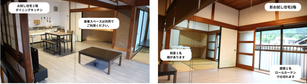 滞在期間は、無料で宿泊場所を提供します。お試し住宅、深山荘別館など村内の宿泊施設で、男性・女性に分かれて共同生活をしていただきます。リフォーム済みの一軒家です。調味料は用意しておりますが、食材はお持ちください。 気になる賃金やその他の注意事項は、高知県移住ポータルサイト「高知家で暮らす。」に掲載中! 「詳細はこちら」のURLからご確認いただけます✨