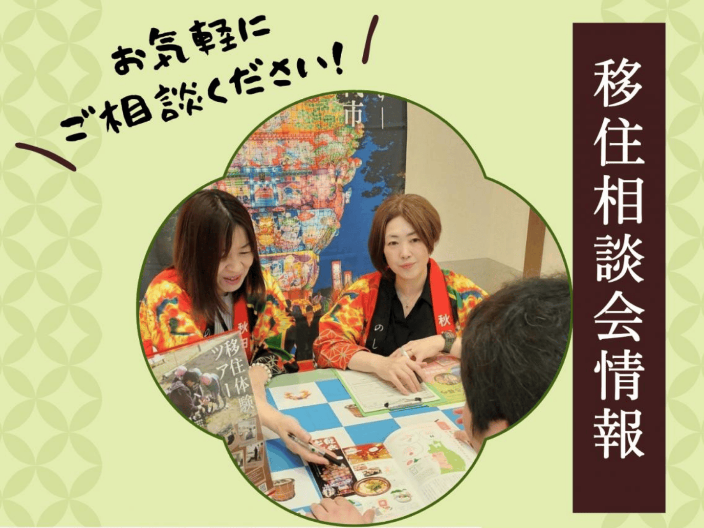 このページでご紹介するのは主に自治体が主催する移住相談会や能代市が参加する相談会です。能代市に住もうと思っている方はもちろん、「いつかは帰ろうかな…」という方や「ちょっと能代に興味があるな」という方も、ぜひご来場ください。対面イベントの能代市ブースでは、観光パンフレットなども持参してお待ちしております♪オンライン相談会も定期開催しますので、お気軽にご参加ください! ・2025年10月26日(日曜日) 【あきた就職フェアin東京】 東京都立産業貿易センター 浜松町館 (東京都港区海岸1-7-1) https://akita-jobnavi.jp/ ・2025年11月9日(日曜日) 【のしろ暮らすオンライン相談会】 オンライン https://www.city.noshiro.lg.jp/sangyo/iju-teiju/18117 ・2025年11月22日(土曜日)・23日(日曜日) 【JOIN移住交流&地域おこしフェア】 東京ビッグサイト(東京国際展示場) (東京都江東区有明三丁目11-1) https://www.iju-join.jp/feature_cont/file/146/ ・2025年12月19日(金曜日) 【のしろ暮らすオンライン相談会】 オンライン ・2026年1月1日(水曜日・祝日) 【元日特別相談会】 のしろ暮らす移住定住相談窓口 (能代市鰄渕字古屋布1番 イオンタウン能代内 ノシローカルスクエア) ・2026年1月12日(月曜日・祝日) 【のしろ暮らすオンライン相談会】 オンライン ・2026年2月15日(日曜日) 【あきた就職フェアin東京】 東京都立産業貿易センター 浜松町館 (東京都港区海岸1-7-1) ・2026年2月20日(金曜日) 【のしろ暮らすオンライン相談会】 オンライン ・2026年3月13日(金曜日) 【のしろ暮らすオンライン相談会】 オンライン