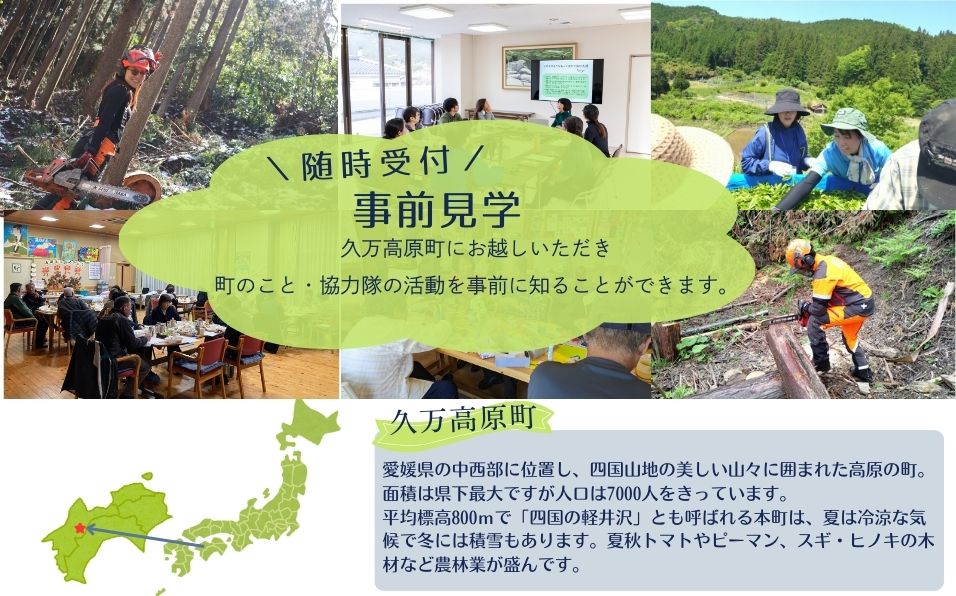 魅力あふれる町を持続させ、豊富な資源を活用してさらなる地域活性化を目指してくれる地域おこし協力隊を募集します! 締め切りは令和7年10月31日(金) ~4つのテーマ別に募集中~ 🌳林業 私たちと一緒に林業を次世代へつなぐ仲間を募集しています。 (2名程度) 🏡地域創り 笑顔と収益が循環する持続可能な地域創り (3名) ✨観光 「Sustainable Island Shikoku・久万高原」~インバウンドの賑わい創出を形にするお仕事です!~ (1名) 💓魅力発信 町の社会課題・魅力や資源のリアルに触れる。 (1名) 応募方法やテーマの詳細等はホームページにてご確認ください。 ご応募お待ちしております。