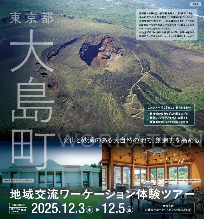 大島は、都心から約120km南の洋上に位置する伊豆諸島最大の島です。 中央には現在も火山活動を続ける三原山がそびえています。 また富士箱根伊豆国立公園に属し、自然と人のつながりを学べる場所として、日本ジオパークにも認定されています。 ▶大島町の詳細情報はこちらから https://pitamachi.com/municipality/detail/359 ーーーーーーーーーーーーーーーーー★★ 大島町地域交流ワーケーション体験ツアー ーーーーーーーーーーーーーーーーーーー ■開催日 12月3日(水)~12月5日(金) 2泊3日 ■旅行代金:無料! ※集合、解散場所までの往復交通費、個人的な買い物や飲食は各自負担となります。 ■募集定員:企業など3社 計15名 (最少催行人数:1社3名) ■集合・解散場所:竹芝客船ターミナル ■申込〆切:10月15日(水) ■申込方法 ①特設サイトにアクセス https://tokyo-tamashima-iju-fair-tour.metro.tokyo.lg.jp/workcation/ ②希望のツアーを選択 ③必要事項をご入力いただき、申込み完了! →選考結果は10月29日(水)までに、申込時のメールアドレスにお送りします。