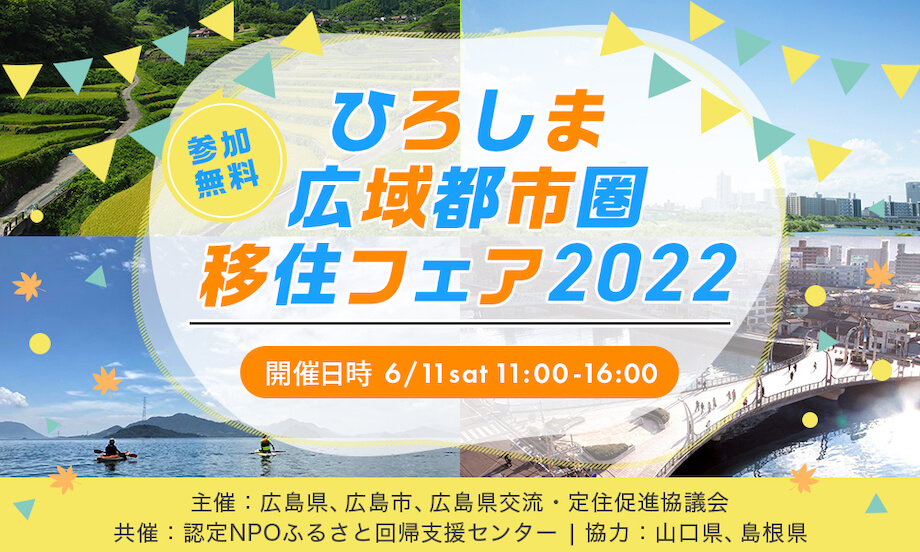 広島・山口・島根の約20自治体&仕事・住まいの団体が大集合! ゲストによるトークイベントや出展市町の情報を一気に収集できる移住フェア 「何かにワクワクする暮らしがしたい」「都会の生活に違和感を感じている」そこのあなた! 自分らしいライフスタイルへの一歩をここから始めてみませんか? 当日は仕事・暮らしのブースでの個別相談はもちろん、セミナーに登壇する先輩移住者に直接話を聞くこともできます! セミナーなど当日プログラムはオンラインでも同時配信♪ 当日、リアル会場に足を運べない方の参加もお待ちしております! 詳細はこちらから https://event.furusatokaiki.net/220611_hiroshima/ <ご参加いただくにあたり以下の点にご留意ください> 1.オンラインでの参加はセミナー視聴のみとなります(ZOOMを使用します)。参加予約いただいた方に、URLをお送りします。 2.来場の方は事前申込者優先でご案内させて頂きます。人数制限の関係でお待ち頂くこともございます。 3.新型コロナ感染防止へのご協力をお願いします(会場へご来場の方) ・来場時にはマスクの常時着用・アルコール消毒・検温をお願いしています。 ・「発熱(概ね37.5°C以上)や風邪の症状(咳、くしゃみ、喉の痛みなどがある」「強いだるさ(倦怠感)や息苦しさ(呼吸困難)がある」「身近に新型コロナウィルス感染症の患者や濃厚接触者がいる」に該当する方は、恐れ入りますが、入場をお断りさせていただきます。