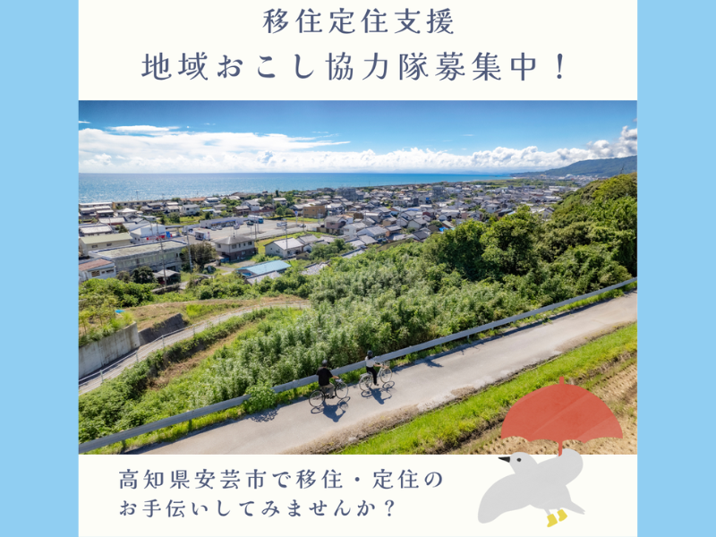 歴史と文化が香る高知県東部の中心都市「安芸市(あきし)」で地域おこし協力隊になりませんか? 【ひとことで言うとこんな仕事】 ・移住や定住の相談対応 ・移住者への安芸市内の案内活動 ・空き家・空き店舗の掘り起こしや空き家・空き店舗バンクの管理・運営 ・移住希望者や移住者に向けたSNS等の魅力発信 ・安芸市内の移住者支援団体での各種活動 ・移住者用の交流始業の企画・運営 ・その他安芸市内への移住・定住増に資すること
