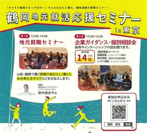 東京都内で令和4年7月9日(土)にイベントを開催します!UIターンをお考えの方は、この機会にぜひご参加ください。 興味のあるプログラムを選んで参加していただくことも可能です。 ★昼の部、夜の部ではお申し込み先、開催場所が異なりますのでご注意ください★ ---------------------------- 昼の部 「鶴岡地元就活応援セミナー」 \こんな方にお勧め/ ・何から始めてよいかわからない ・企業人事の方と話してみたい ・鶴岡/庄内の仕事や移住情報を聞いてみたい ・インターンシップの情報を聞いてみたい ▶就職の不安を払拭! 山形出身のUIターンコンシェルジュから、就職を取り巻く状況や就職のノウハウについて学べるセミナーを開催。就職・転職の不安を解消しましょう! ▶多種多様な地元企業を知れる! 製造、サービス、福祉、交通運輸など13社の企業が参加します!人事担当から、事業内容や採用、インターンシップの情報交換が行えます。 ▶きめ細やかな個別相談 UIターンの移住の担当者が、支援情報などのご相談に応じます! 【時間】12:00~16:30 【会場】タワーホール船堀2F 平安・瑞雲の間 【申し込み期限】令和4年7月1日(金)まで [申込フォーム] https://docs.google.com/forms/d/e/1FAIpQLSe-Fxk7lvL7u0bca9Cqv_0aElNLvt5S_lNaAI2el1GYfzZzRg/viewform =========================== 「鶴岡地元就活応援セミナー」URL https://www.city.tsuruoka.lg.jp/kurashi/shigoto/syukatsu_semi200208.html =========================== 【問い合わせ先】 鶴岡市商工課 TEL: 0235-25-2111 FAX: 0235-25-7111 MAIL: shoko@city.tsuruoka.yamagata.jp