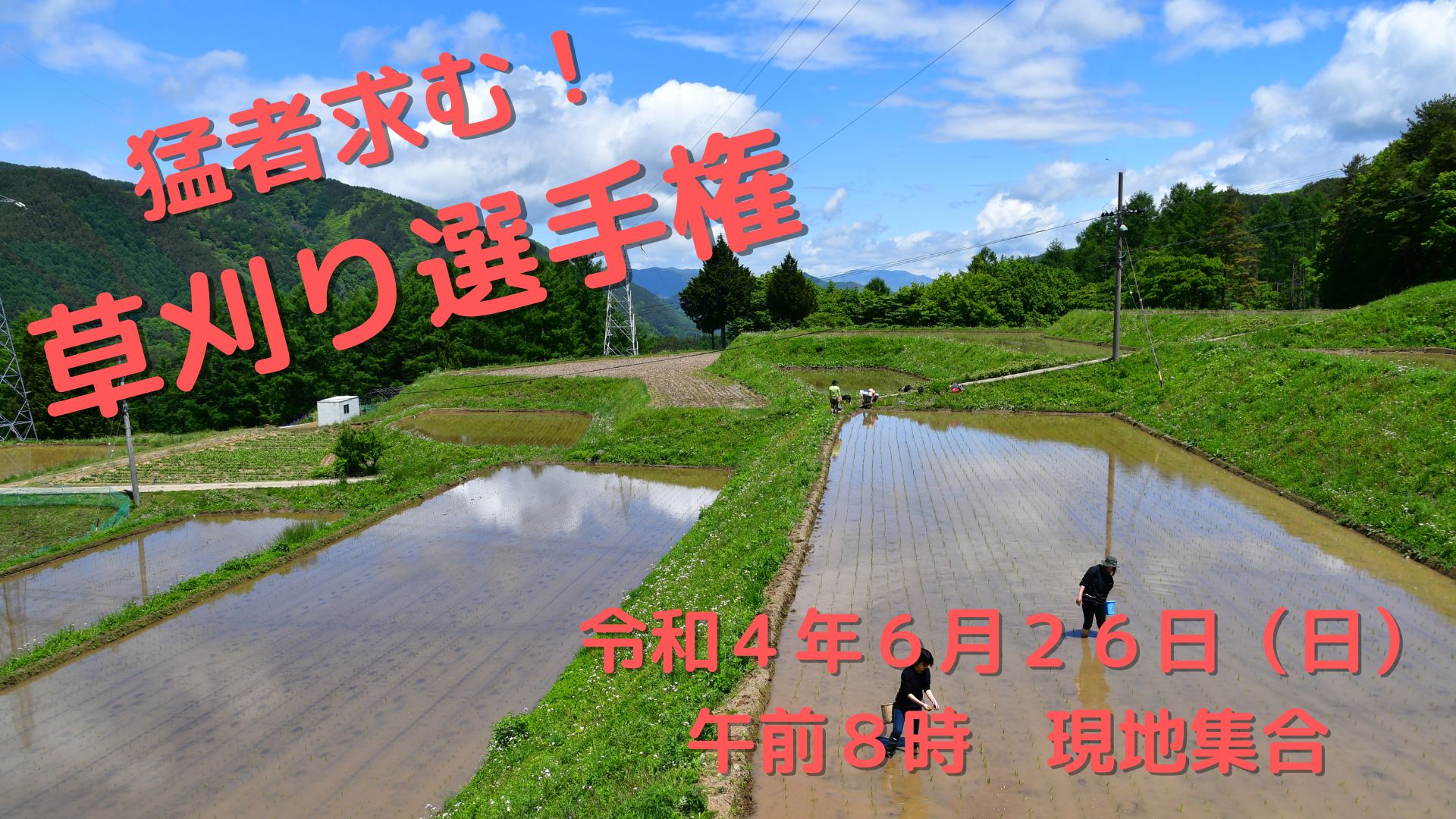 猛者求む!長谷の棚田で草刈り選手権! 長年にわたる耕作放棄地だった棚田を復活させ、新・棚田百選にも選ばれたthe rice farmの田んぼ。 そんな田んぼの法面で草刈り選手権を開催します! 普段は仕方なくやる草刈り。でもどこかにこだわりを持っているはず! あなたのこだわりをみんなに披露しませんか? 伊那市の長谷地域で作られるWakka Agriさんのお米は、すべて海外輸出用。 海外の健康志向の高いユーザー向けに、自然栽培でお米作りをしています。 メインの品種「カミアカリ」は国内でも数件の農家さんでしか栽培されていない、貴重な品種。 今回はWakka Agriさんの棚田の法面を使って草刈り選手権を開催します! 棚田の法面の傾斜は約40度!傾斜にも負けない、草刈りに自信のある猛者の参加をお待ちしています! 地域の方、すでに移住された方、田植えや自然農法に興味のある方、是非ご参加ください!