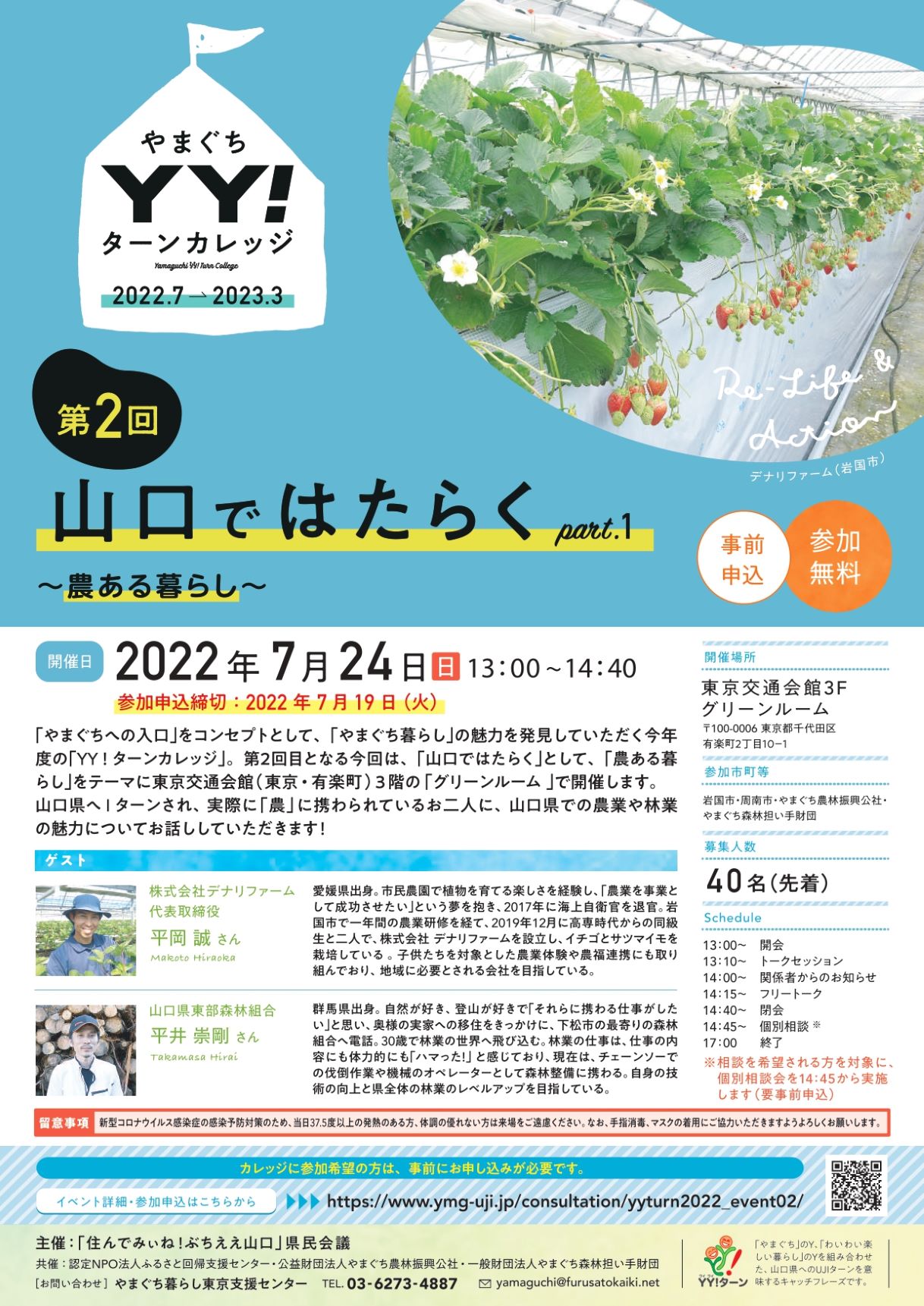 「山口ではたらく」として、「農ある暮らし」をテーマに東京交通会館(東京・有楽町)3階の「グリーンルーム」で開催します。 山口県へIターンされ、実際に「農」に携わられているお二人に、山口県での農業や林業の魅力についてお話ししていただきます! また、当日は、山口県の農業就業窓口の担当者、林業就業窓口の担当者のほか、山口県、周南市、岩国市の移住窓口担当者と、直接、じっくりと相談することができますので、農業、林業にご関心のある方はもちろん、山口県にご関心のある方も、ぜひご参加ください!