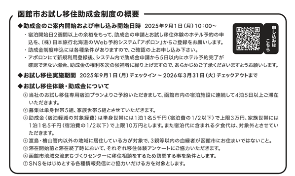 *ご家族(2名以上)でお試し移住いただく方を『家族世帯』となります *助成金は1泊1名5千円(宿泊費の1/2以下)で上限10万円とします *お試し移住の実施期間は3月31日(火)チェックアウトまでとなります 詳細はホームページをご参照ください ご不明な点がございましたらお気軽にお問い合わせください! 皆様の函館市へのお越しをお待ちしております。