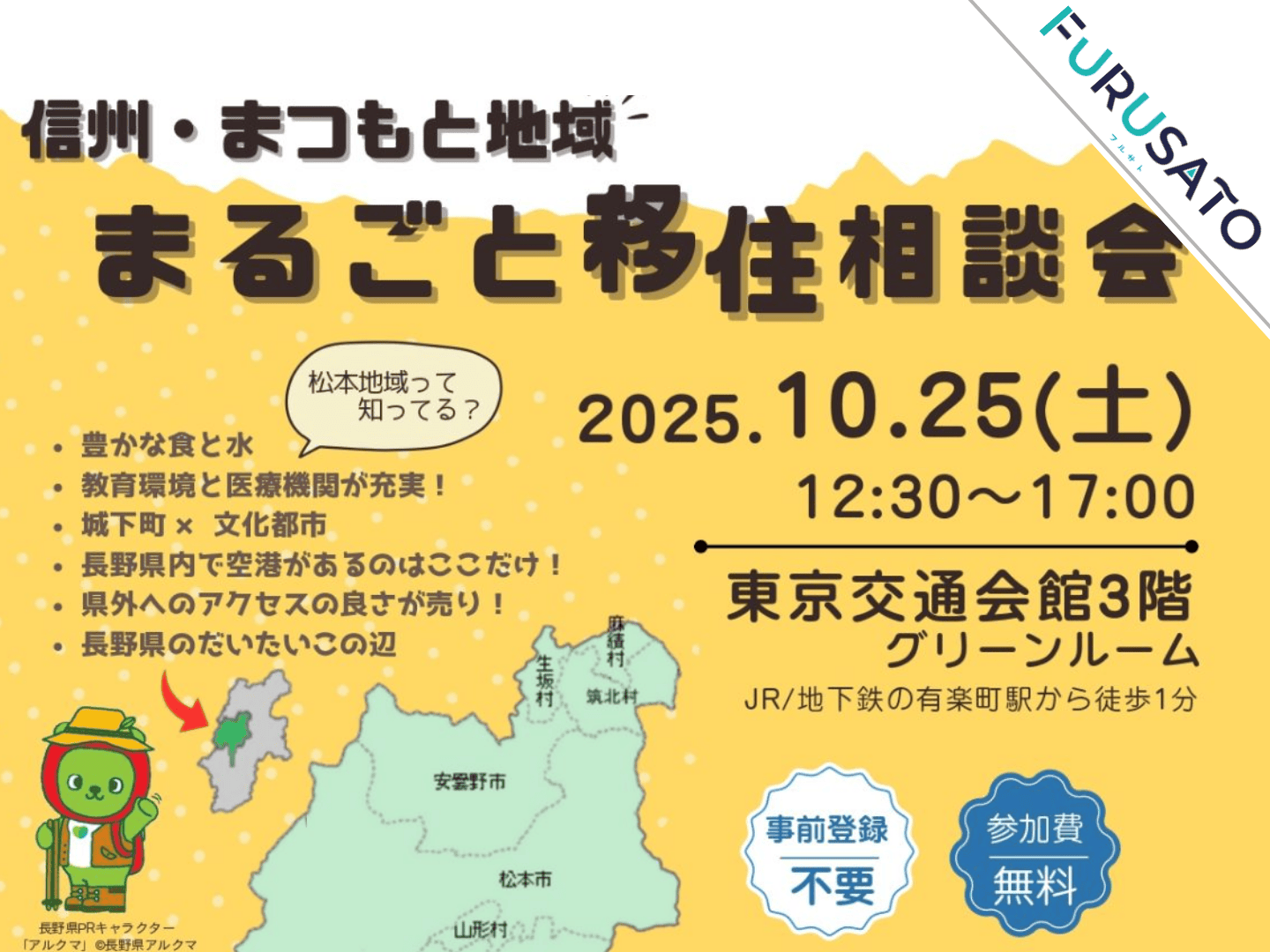 松本地域の8市村(松本市・安曇野市・塩尻市・筑北村・麻績村・生坂村・山形村・朝日村)が一堂に集まる年の一度の大相談会を開催します。 移住相談、就職相談、住まいの相談、農ある暮らしの相談のほか、先輩移住者にも相談でき、松本地域のことをまるごと知ることができる絶好の機会です。 ぜひご参加ください!! \松本地域はこんなところ/ 🍎豊かな⾷と⽔ 🍏教育環境と医療機関が充実! 🍎城下町×⽂化都市 🍏⻑野県内で空港があるのはここだけ! 🍎県外へのアクセスの良さが売り! ーーーーー 信州・まつもと地域 まるごと移住相談会 ーーーーー ■開催日: 2025年10月25日(土) 12:30~17:00 ■開催場所: 東京交通会館3階グリーンルーム (東京・有楽町) ■参加費:無料! 事前登録不要!! 【参加自治体】 松本市・安曇野市・塩尻市・筑北村・麻績村・生坂村・山形村・朝日村 ▶詳細はこちらから https://www.furusato-web.jp/event-info/p234645/