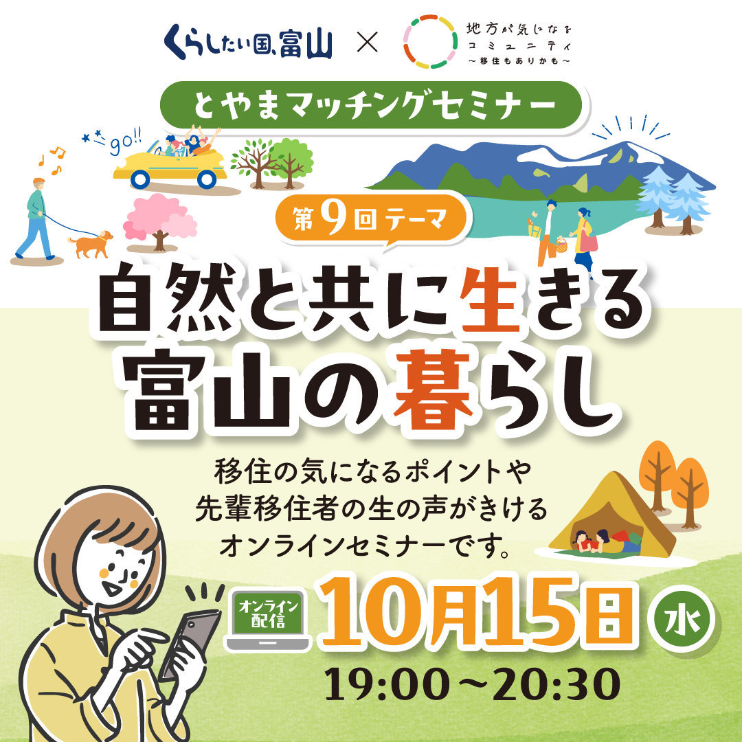 ・・・・・・・・・・・・・・・・・・・・・・・・・・・・・・・・・・・・・・ みなさん、こんにちは!産経新聞社の「地方が気になるコミュニティ」です。 「地方が気になるコミュニティ」では、地方の魅力や、地方暮らし、移住について、みなさんの想いを自由に話していただく場で、地方創生や移住にまつわるさまざまなイベント情報もお届けしています! ・・・・・・・・・・・・・・・・・・・・・・・・・・・・・・・・・・・・・・ 「地方が気になるコミュニティ」は、今年度、富山県とコラボ! 移住に興味がある方や、地方での新しい暮らしやキャリア、ライフスタイルを模索している方に向けて、オンライン移住セミナーを全15回にわたって開催しています。 第9回のテーマは「自然と共に生きる富山の暮らし」。 名峰・立山連峰をはじめ、四季折々の豊かな自然に囲まれた富山県は、ほどよい利便性を保ちながらも、海や山、田園がすぐそばにあり、日常の中で「自然と共にある暮らし」を実感させてくれます。 今回のセミナーでは、そんな環境で暮らす先輩移住者をゲストに迎え、自然とともに生きる豊かさや、新しいライフスタイルの可能性をお届けします。 「自然豊かな環境で暮らしたいけれど、実際はどうなの?」――そんな疑問に応える、リアルな富山の暮らしを知るきっかけとなる内容です。