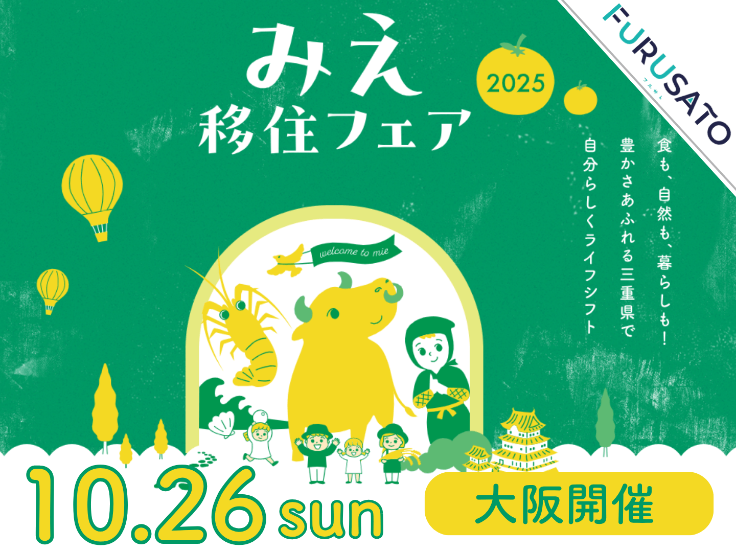 三重県内の市町&関係団体が集結する、三重県最大の移住マッチングイベント! 地域の情報や移住にまつわる取組・制度を知ることができ、 何より魅力あふれる三重の人たちとつながることが出来るお祭りです。 三重県ならではの文化に触れることのできる体験・ワークショップもご用意しましたので、 ゆかりのある方も、みえ初心者の方も、ぜひ皆さまご参加ください。 ーーー みえ移住フェア<大阪会場> ーーー ●日時: 2025年10月26日(日) 11:00~16:00 ●会場: OMM2階 F-F2ホール (大阪府大阪市中央区大手前1-7-31) ●参加費:無料! ※ご予約なしでも参加可能ですが、事前登録がスムーズです 来場いただいた方には先着150名様に「メイドインみえお菓子」をプレゼント! ▶詳細はこちら https://event.furusatokaiki.net/miefair2025/