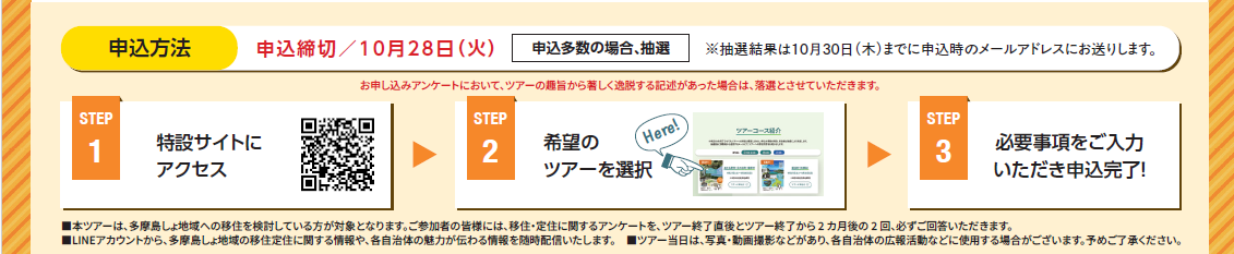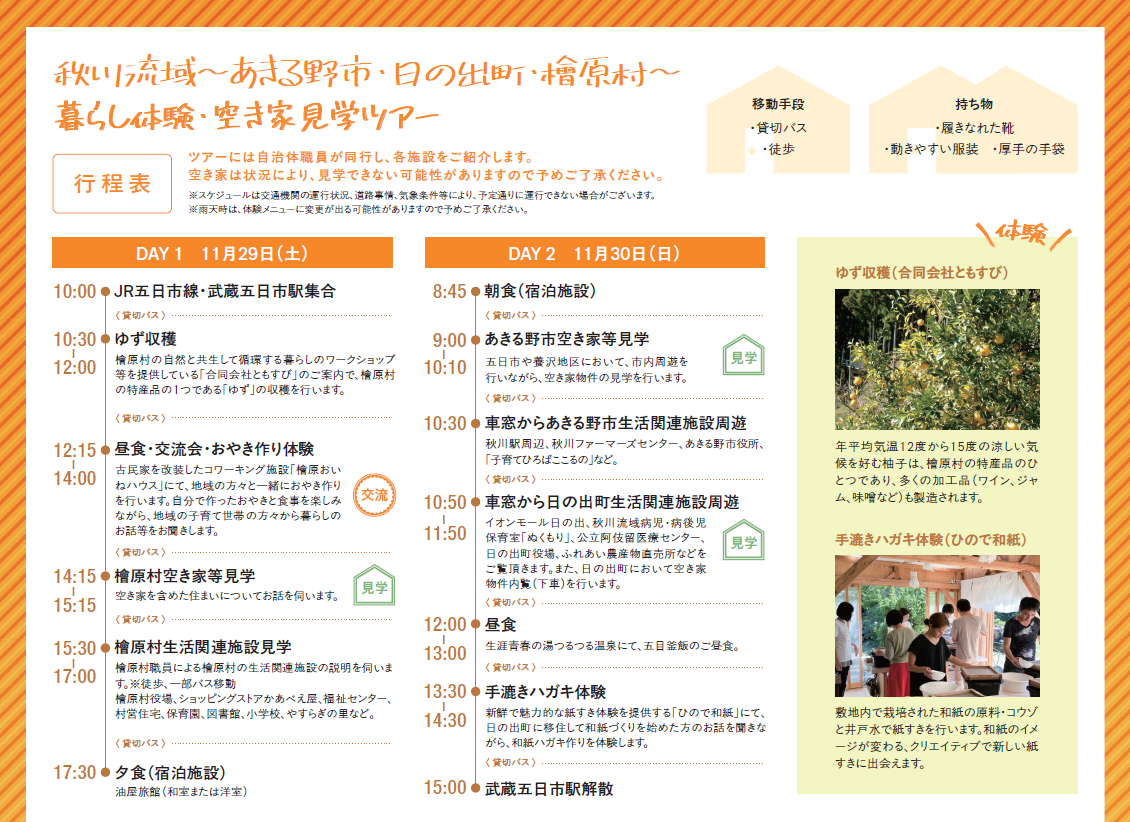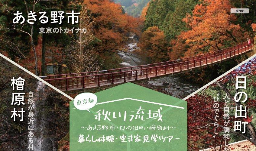 秋川の流域にある東京都あきる野市・日の出町・檜原村の3つの自治体を訪問し、暮らしの体験や空き家の見学を行うツアーです。 それぞれの地域を知り、移住後の生活をイメージしてみましょう! ▶各地域の詳細情報はこちらから あきる野市:https://pitamachi.com/municipality/detail/394 日の出町:https://pitamachi.com/municipality/detail/368 檜原村:https://pitamachi.com/municipality/detail/358 ーーーーーーーーーーーーーーーーーーーーーーーーーーーーーーーー★★ 秋川流域(あきる野市・日の出町・檜原村)暮らし体験・空き家見学ツアー ーーーーーーーーーーーーーーーーーーーーーーーーーーーーーーーーーー ■開催日 11月29日(土)~11月30日(日) 1泊2日 ■旅行代金:無料! ※集合、解散場所までの往復交通費、個人的な買い物や飲食は各自負担となります。 ■募集定員:15名 (最少催行人数:1名) ■集合・解散場所: JR武蔵五日市駅 ■申込〆切:10月28日(火) ■申込方法 ①特設サイトにアクセス https://tokyo-tamashima-iju-fair-tour.metro.tokyo.lg.jp/tour/ ②希望のツアーを選択 ③必要事項をご入力いただき、申込み完了! →抽選結果は10月30日(木)までに、申込時のメールアドレスにお送りします。