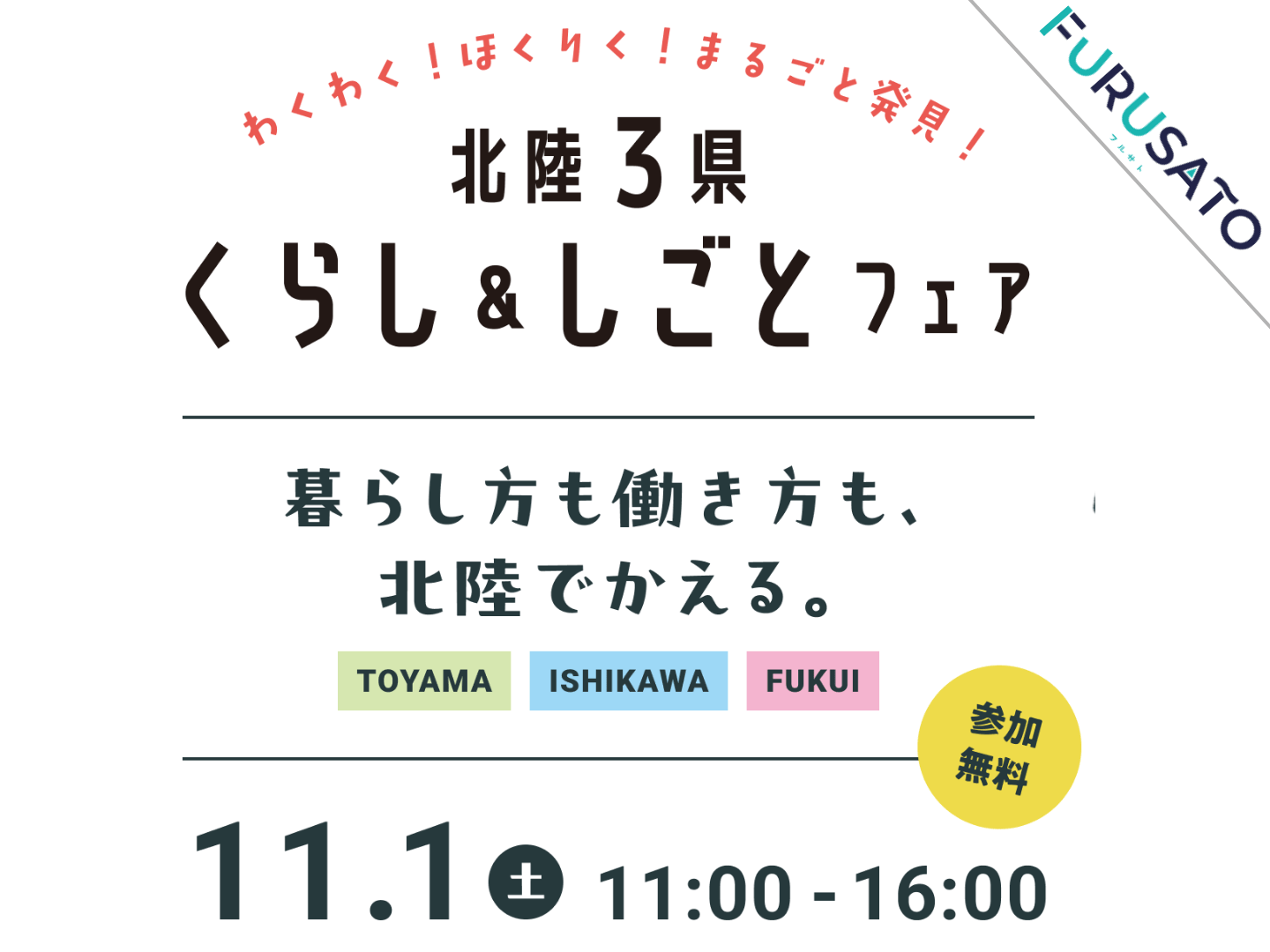 北陸3県(富山県・石川県・福井県)が初めて合同で開催する移住フェア。 テーマは、「わくわく!」 食や文化はもちろんのこと、ものづくり産業や暮らしの環境も、 実は魅力いっぱいの北陸。 そんな3県の地域や人、仕事とのわくわくする出会いを楽しめるイベントです。 北陸ならではの文化を体験できるワークショップも充実! 北陸のことをよく知らない方はもちろん、 ご出身・ゆかりのある方も、ぜひ気軽にあそびにきてくださいね! ーーー🦀🦀🦑 北陸3県 くらし & しごとフェア ーーーーーーー ■日時: 2025年11月1日(土) 11:00~16:00 ■会場: 東京交通会館12階 ダイヤモンドホール+カトレアサロンAB (東京都千代田区有楽町2-10-1) ■参加費:無料! ※ご予約なしでご来場いただけます。 事前登録をしていただくと、入場がスムーズです。 ご来場いただいた皆様に、北陸3県ならではのお土産プレゼント! ▶詳細はこちら https://event.furusatokaiki.net/hokurikufair2025/