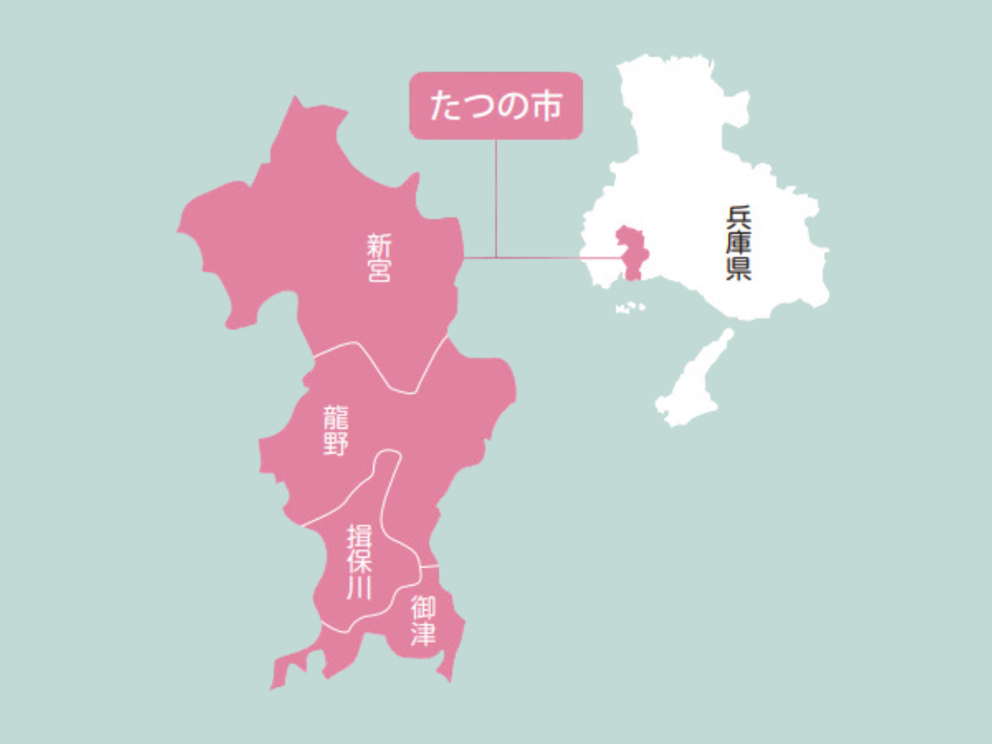 たつの市は大きく4つのエリアに分かれています。 ーーーーー 龍野エリア ーーーーー 龍野エリアは、清流揖保川と緑豊かな鶏籠山に囲まれた「播磨の小京都」と呼ばれる歴史ある城下町です。 市街地には武家屋敷や土蔵が残り、江戸時代の建物や醤油醸造施設も保存されています。 地域産業としては、醤油や素麺、皮革のほか、紫黒米の生産が盛んです。 また、赤とんぼの里として童謡文化を推進し、さくら祭や市民まつりなど多彩なイベントがまちを盛り上げています。 ーーーーー 新宮エリア ーーーーー 新宮エリアは、揖保川と栗栖川沿いに広がる平野と、周囲の丘陵地から成り立つ地域です。 西部には、播磨科学公園都市があり、世界最大級の放射光施設「SPring-8」や先進的ながん治療を行う粒子線医療センターがあります。 また、北部には弥生時代からの「新宮・宮内遺跡」をはじめ、屏風岩や吉島古墳など国指定の文化遺産が多く、歴史と最先端の技術が共存するエリアです。 ーーーーーー 揖保川エリア ーーーーーー 揖保川エリアは、揖保川と豊かな自然に囲まれたたつの市の交通の要所です。 田園住宅都市としての開発が進む一方、南部ではトマトや花の栽培が盛んで、地域全体で農業振興に力を入れています。 地場産業では、醤油醸造や全国一のシェアを持つエアバッグ部品製造など、高度な技術を持つ企業が活躍しています。 また、国指定の永富家住宅や「ヤッホの森」など、歴史と自然を楽しめるスポットも豊富です。 ーーーーー 御津エリア ーーーーー 御津エリアは、自然の海岸線と四季折々の魅力があふれる瀬戸内に面した地域です。 新舞子浜では潮干狩りや海水浴が楽しめ、綾部山梅林や世界の梅公園では春の花見が人気です。 歴史ある港町・室津には賀茂神社や室津民俗館などの文化財が残り、ゆったりとした雰囲気の中で歴史に浸れます。 また、新鮮な魚介類や地元産の野菜、特産品の梅製品や清酒神力も楽しめ、全国有数のランドセル生産地でもあります。