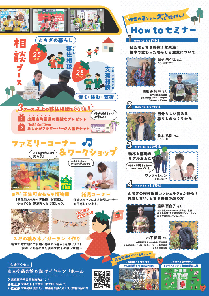 栃木県内の全25市町と県関係団体+企業・団体が大集結! ゲストによるトークイベントや市町・企業ブースで情報を収集しながら 県や市町の移住担当者と直接つながることのできるフェアです。 ーーーーー🍓🍓🍓 オールとちぎ移住&しごとフェア ーーーーー ■開催日: 2025年11月16日(日) 11:00-16:00 ■会場: 東京交通会館12階ダイヤモンドホール (東京都千代田区有楽町2-10-1) ■参加方法: ご予約なしでもご来場いただけます。 11/14(金)23:59までに事前予約いただいた方には「ミニいちごジャム」をプレゼント! ※当日お渡しできる数に限りがございます。なくなり次第終了となりますのでご了承ください。 ▶詳細はこちら https://www.tochigi-iju.jp/alltochigi2025/