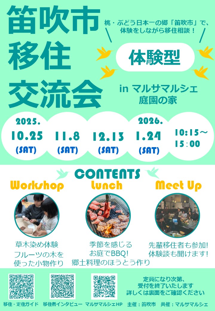 山梨県笛吹市へ移住を検討されている皆さまを対象に、体験型の移住交流イベントを開催します! 市内にある古民家にて、体験型ランチ・簡単な農体験・移住相談・交流会がお楽しみいただけます。 こちらの交流会には既に移住をされた方や地域の方も参加し、貴重な体験談を聞くことができます!この機会に移住後の生活をリアルに感じてみませんか? 昨日までに秋の会を2回実施し、参加された方から『地域の方や先輩移住者からのお話で、市内での生活をイメージすることができた』などの好評をいただきました。 残り2回の開催です!冬の笛吹市でお待ちしています! 笛吹市移住交流会 in マルサマルシェ庭園の家概要 📅 第3・4回開催日:2025年12月13日(土)、2026年1月24日(土) ※第1・2回は終了いたしました。 🕒 時間 石和温泉駅集合の方▶ 10:15~15:00(笛吹市内巡り含む) 車などで現地集合の方▶ 10:40~13:45(現地解散となります) 🚃 アクセス・集合場所 集合場所:JR石和温泉駅 または 現地(マルサマルシェ庭園の家) JR石和温泉駅から会場まで市の無料送迎あり 🌿 体験内容 ワークショップ:草木染め体験 or フルーツの木を使った小物作り ランチ:郷土料理の「ほうとう」作り 先輩移住者・地域の方との交流会:実際に移住された方のリアルな体験談が聞けます! ※体験内容が変更となる場合があります。 👨👩👧👦 募集概要 定員:各回10組20名まで 参加費:1組2名まで無料(駅・現地までの交通費は自己負担) 申込締切:イベント実施日の4日前まで 🍑 「桃・ぶどう日本一の郷」笛吹市で、季節の体験を通じて移住の魅力を感じてみませんか? 🔗 お申し込み・お問合せ 📞 マルサマルシェ笛吹店:0553-47-4447(営業時間10:00〜17:00/火曜定休) 📧 営業時間外のお問い合わせは yoyaku.marusa.marche@gmail.com まで