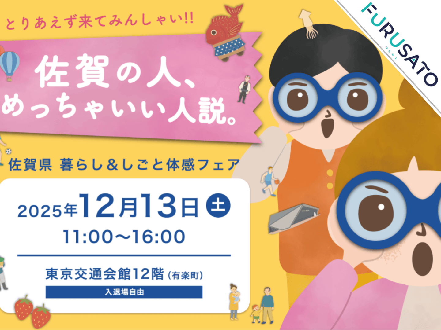 佐賀県内のたくさんの企業・団体・市町が一堂に会するイベントを今年も東京で開催します。 佐賀暮らし・地方での移住や仕事・子育て環境などが気になる人におすすめ! ものづくり体験やトーク&クイズ大会、スポーツ体験や個別相談ブースなど 佐賀の「めっちゃいい人・もの・こと」が盛りだくさんの移住フェアを開催します。 ーーーーー 佐賀県 暮らし&しごと体感フェア ーーーーー ■日時: 2025年12月13日(土)11:00~16:00 ■場所: 東京交通会館12階ダイヤモンドホール (東京都千代田区有楽町2丁目10-1) ■参加費:無料! ※事前申込&当日来場で、 佐賀のいいものをプレゼント!(先着順) ▶詳細はこちら https://www.sagasmile.com/sagataikanfair2025/
