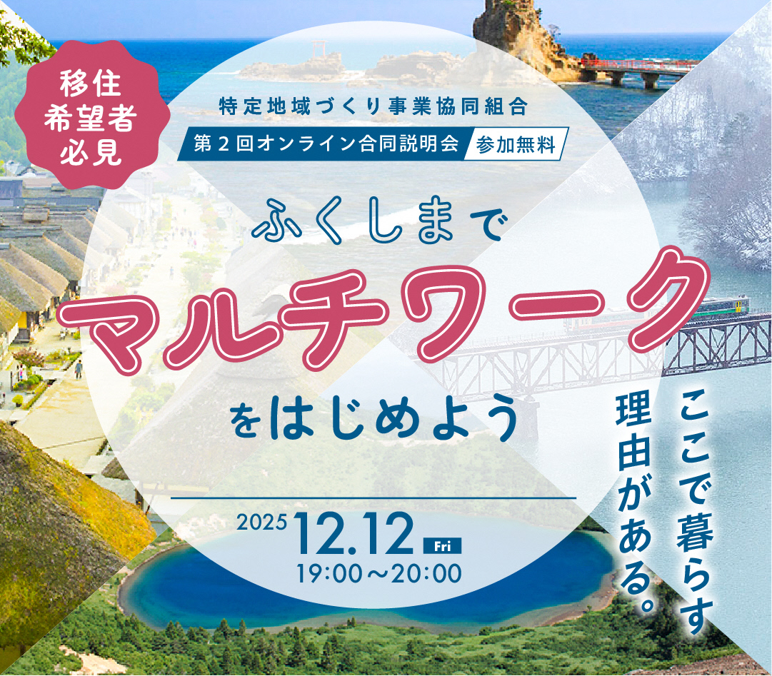 福島県でマルチワークを始めてみませんか? マルチワークとは、季節や時間によって複数の仕事に携わる働き方です。 福島県内では、地域の複数の事業者に人材の派遣を行う「特定地域づくり事業協同組合」が増えており、 多くのマルチワーカーが地域の担い手として活躍しています。 今回の説明会では、福島県内の3つの組合から、各地域ならではの魅力や働き方についてご紹介します! さらに、今回は現役のマルチワーカーにもご登場いただき、ご自身の移住体験などについて語っていただきます。 参加料は無料!! 移住先や新しい働き方に対する情報収集に、ぜひご参加ください。 ーーーーーーーーーー詳細情報ーーーーーーーーーー ■開催日時 :令和7年12月12日(金)19時00分~20時00分 ■参加方法 :オンライン(Zoom) ■対象者 :福島県内への移住を検討している方、マルチワークや田舎暮らしに興味がある方 等(福島県在住者も可) ■プログラム (1)特定地域づくり事業協同組合制度について (2)各組合プレゼンテーション (3)先輩マルチワーカーの移住体験トーク (4)質疑応答 ■申込方法 下記URLよりお申し込みください。 ※申込締切:令和7年12月11日(木) https://fukushima-multiwork.com/events/12_12