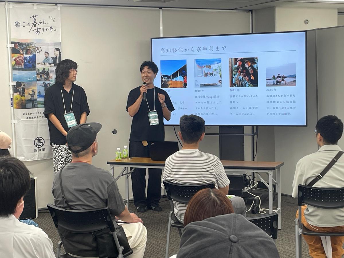 学生起業や離島移住を経て、高知県奈半利町の地域おこし協力隊に着任されたお二人。どうして高知へ?田舎移住、田舎起業ってどんな感じ?お二人のリアルな暮らしをお聞きしました。 實重 優(さねしげ ゆう)さん[左] 井出 風之介(いで ふうのすけ)さん[右] 出身地:島根県(實重さん)、神奈川県(井出さん) 現住所:奈半利町 移住年:2024年 職業:地域おこし協力隊 同い年のお二人は、共に進学した高知大学地域協働学部で出会い意気投合。在学中はフィールドワークを通して地域活性について学びます。 ローカル情報誌を制作したり防災イベントを企画したりするなど、地域住民の協力を得ながら精力的に取り組んでいました。 お互いに「いつか一緒に仕事がしたいね」と話していましたが、偶然に島根県の離島・隠岐の島へ行く機会があり、そこで出会った人たちとのご縁から学生起業へチャレンジすることに。 合同会社を立ち上げ、大学を1年間休学して現地へ飛び込みました。