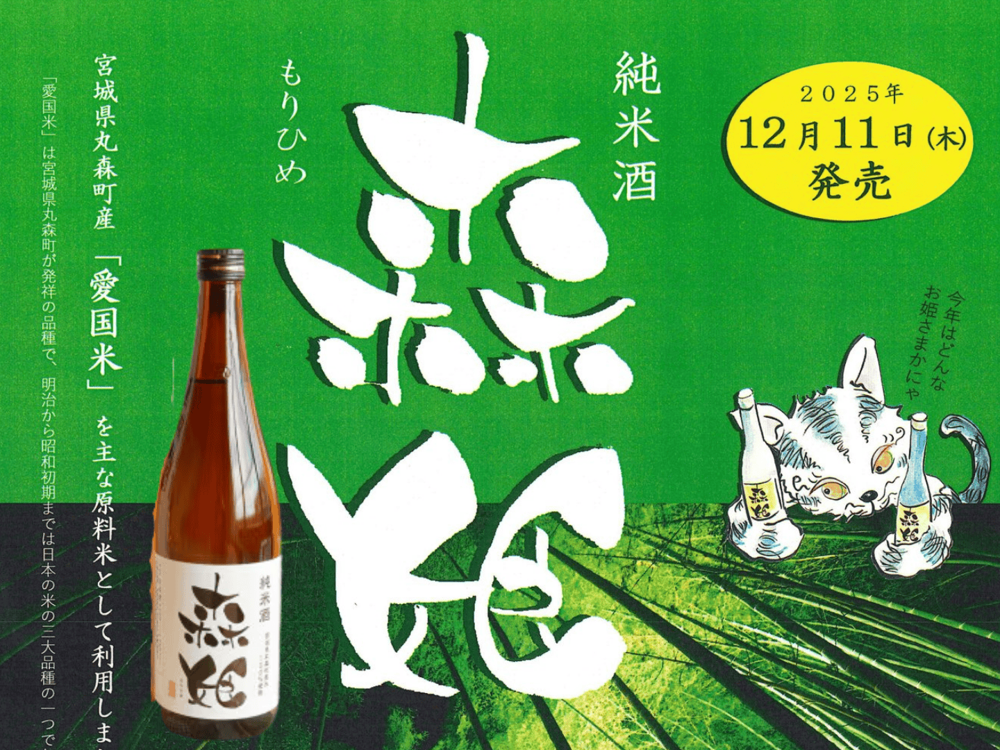 2025年12月11日(水)から、「愛国米」など丸森産米を100%使用した純米酒『森姫(もりひめ)』の販売が始まりました。「愛国米」は丸森町が発祥の品種で、明治から昭和初期まで日本の米の三大品種の一つでした。今年はキリっと淡麗な味わいに仕上がっているようです。ぜひご賞味ください。