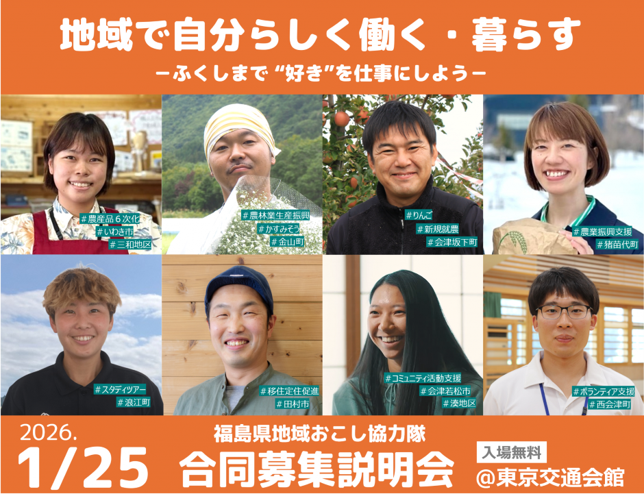 🍀1月25日(日) 福島県地域おこし協力隊合同募集説明会に西会津町が出展します! この合同募集説明会では、自治体の担当者や現役の地域おこし協力隊員と直接話しながら、地域のリアルな暮らしや活動内容を知ることができます。 ネットだけではわからない“地域の空気感”や“地域おこし協力隊の魅力”を、ぜひ感じてください。 ~西会津町ブース~ 令和8年4月採用予定の募集分野を中心に地域おこし協力隊に関する相談を受け付けます。町の担当スタッフのほか、現役の地域おこし協力隊員が参加予定となっております! 🌟入場は無料🌟 スムーズに相談できる事前予約がおすすめです。 下記専用ページよりご予約下さい。 ーーーーーーーーーーーーーーーーーーーーーーーーー 【専用ページ】 下記よりふくしま連携復興センターの専用ページをご覧いただけます。相談がスムーズな事前予約がおすすめです。 https://f-ninaite.jp/topics/17963.html ーーーーーーーーーーーーーーーーーーーーーーーーー 皆様のご来場お待ちしております!!