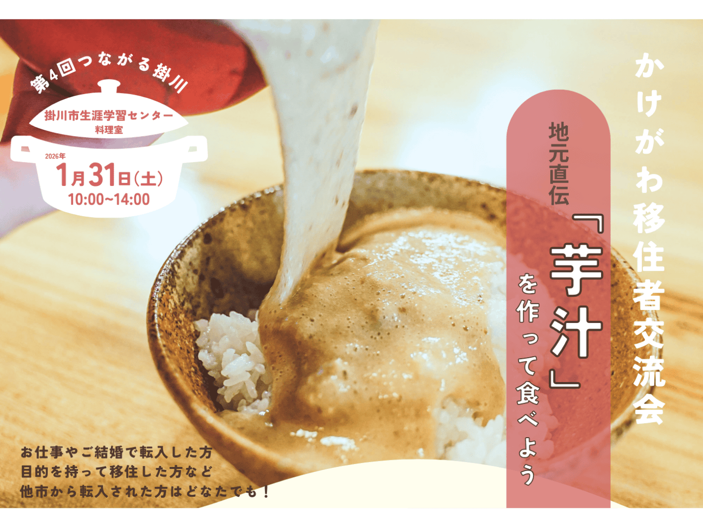 掛川での暮らしをもっと楽しく 遠州地方ならではの郷土料理「芋汁」を地元の方と一緒に調理・実食します。 「作り方を知りたい」「移住者同士お話してみたい」という方、ぜひご参加ください。 美味しい掛川の魅力を発見しましょう! What is IMOJIRU? 遠州の郷土料理「芋汁」は、すりおろした自然薯と味噌汁を混ぜ合わせた料理です。 特徴は、出汁の選び方と味噌汁への合わせ方にあります。 出汁は一般的に鯖をベースとすることが多いですが海産物に限らず多様であり、この出汁と味噌の配合こそが各家庭に伝わる「わが家の味」の決め手となっています。 掛川の豊かな風土が育んだこの味を、地元の方から教わりあなたの家庭だけの新しい味を創りませんか? 開催概要 日時 2026年1月31日(土)10:00〜14:00 09:45〜集合 10:00〜開始・作り方の説明 10:15〜みんなで調理 12:15〜みんなで昼食 12:55〜交流会 13:35〜お片付け 14:00〜解散 会場 掛川市生涯学習センター 調理室 対象 現在掛川市内にお住まいの転入者・移住者の方 ※お仕事や結婚で転入した方、目的を持って移住した方など、他市から転入された方はどなたでも可能です。 定員 先着20名 参加費 大人(小学生以上)1,000円/1名 こども(未就学児)/無料 ※3歳未満無料 持ち物 エプロン、三角巾またはバンダナ、マスク、手拭きタオル 申込 申込方法 以下よりお申し込みください。 https://forms.gle/vA4nDRW7858FSwtv8