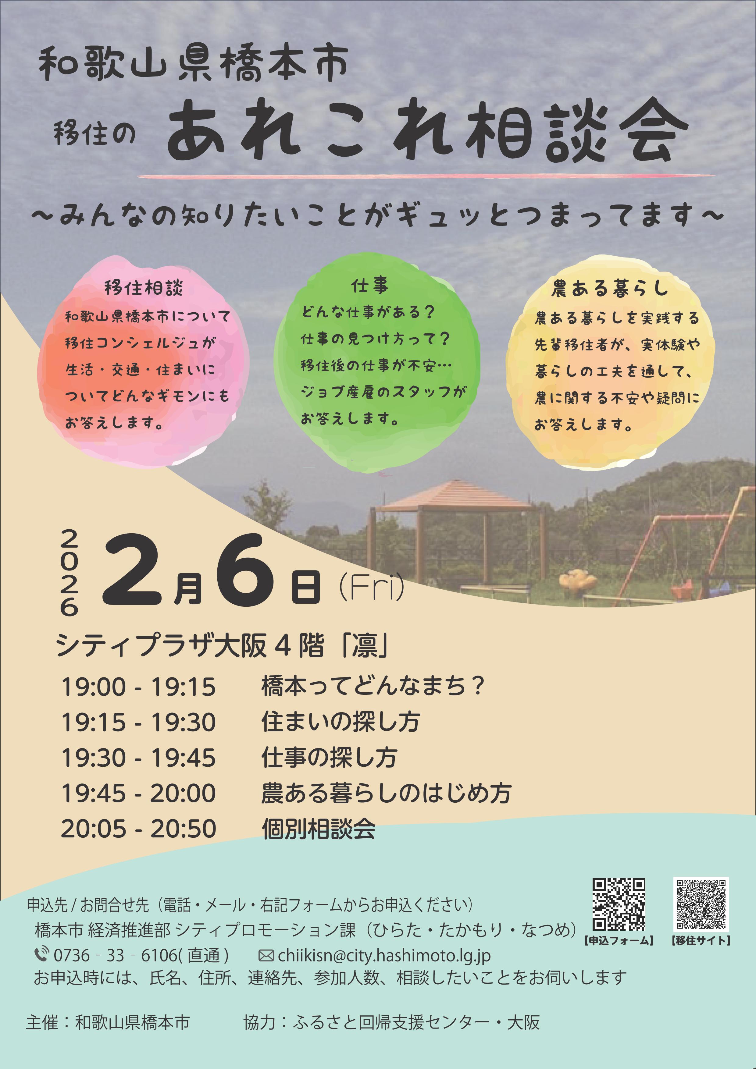 橋本市 移住のあれこれ相談会(ナイター) 日時:2月6日 金曜日 午後7時~午後8時50分まで 場所:シティプラザ大阪4F(大阪市中央区本町橋2-31) 内容:19:00~19:15 橋本ってどんなまち? 19:15~19:30 住まいの探し方 19:30~19:45 仕事の探し方 19:45~20:00 農ある暮らしのはじめ方 20:00~20:50 個別相談(※参加希望者のみ) 大阪・本町にて、皆さんの気になる"あれこれ"をギュッとつめたナイター相談会を開催します! 「住まいの探し方」「仕事の探し方」「農ある暮らしのはじめ方」の3つのテーマをお話します! それぞれの不安や疑問に、各相談員が個別相談でもお答えしますので、お一人ではわからないようなこともこの機会にぜひお聞かせください。 お仕事終わりのご来場も大歓迎です。