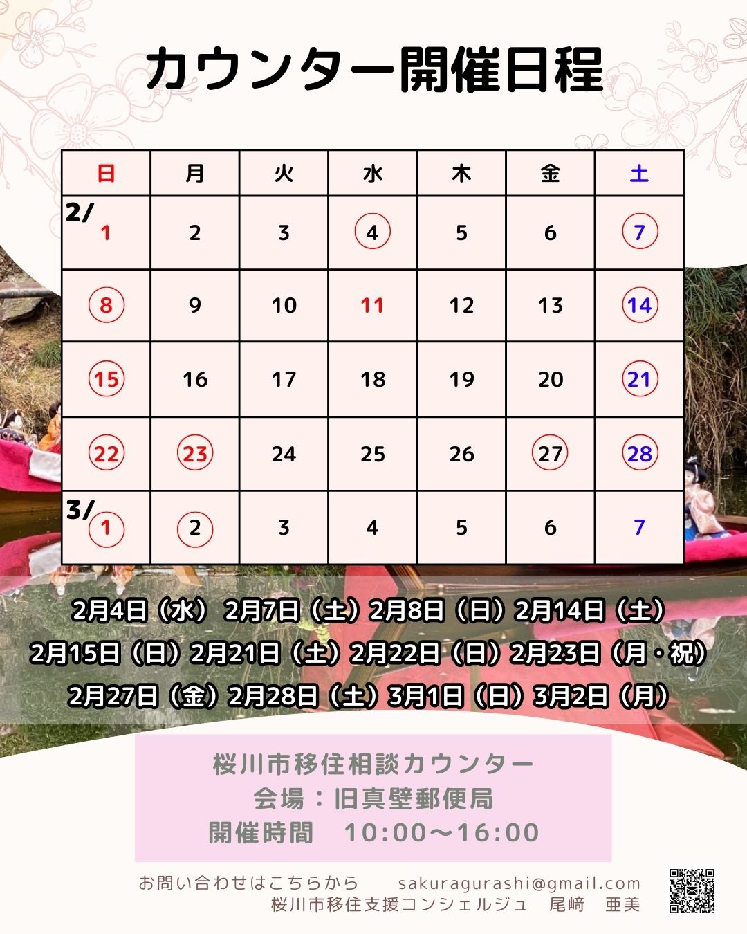 茨城県桜川市では、2月4日から3月3日にかけて開催される「真壁のひなまつり」開催に合わせて、移住相談カウンターを現地に設置し、移住相談を受け付けます。 真壁の町並みを歩き、お雛様を堪能した後は、移住に向けて情報収集をしていきませんか? 実際に現地を訪れることで移住へ向けてのイメージをより鮮明にしていただけると思います。 ご予約は専用フォームからお願いします。ご予約優先となりますが、事前連絡がない場合でも現地で対応させていただきますので是非この機会にお立ち寄りください。 現地で、空家バンクの情報や求人情報などもご確認いただけます。移住検討にご活用ください。 会場の旧真壁郵便局は、有形登録文化財です。お雛様の展示はもちろん、トイレの利用や、休憩所としての利用も可能となっています。 ぜひ一度お立ち寄りください。
