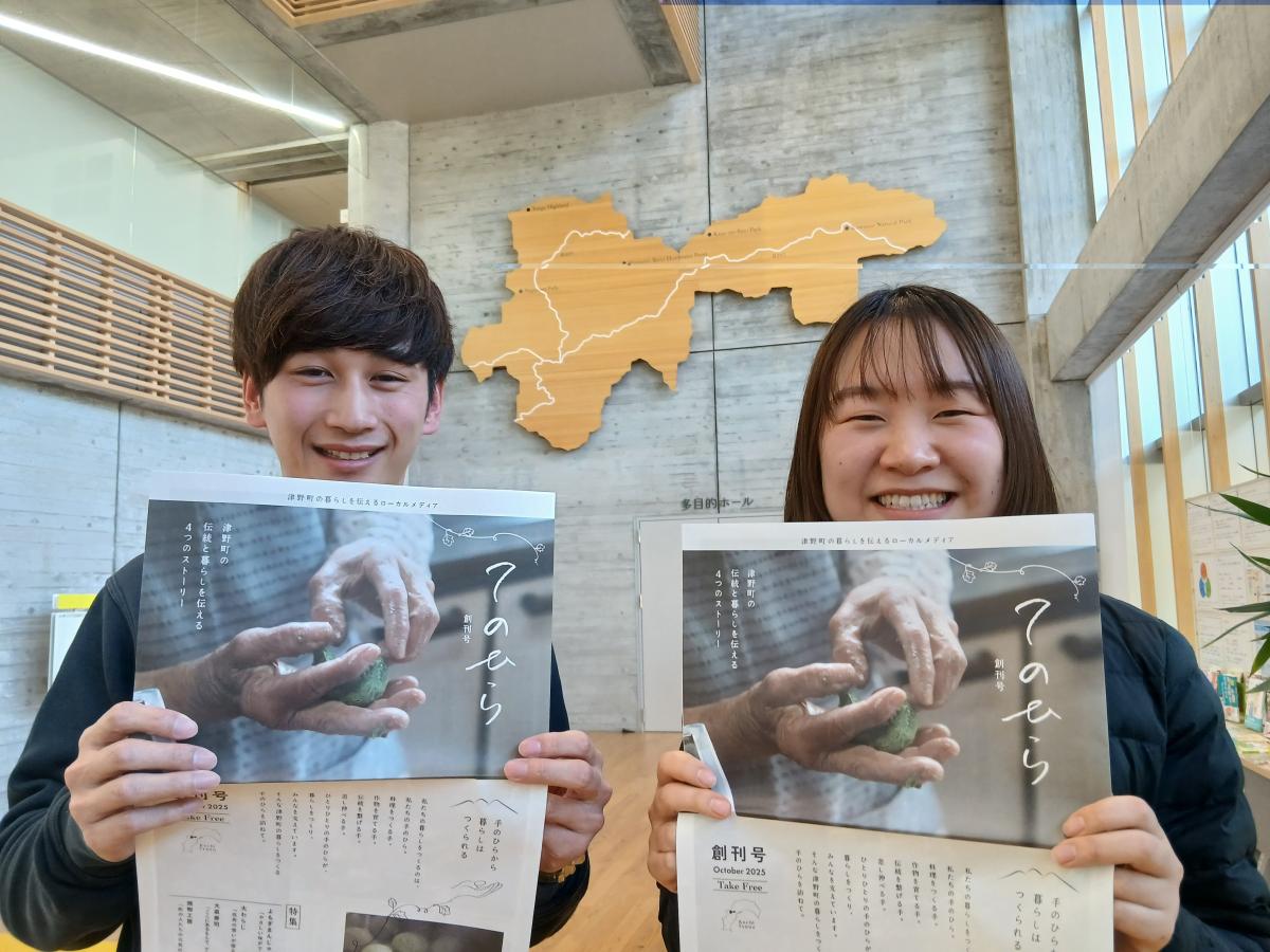 TOP画像左:森下翔太さん TOP画像右:猪俣美和さん 出身地:森下さん・高知県、猪俣さん・新潟県 現住所:津野町 移住年:2024年 職業:地域おこし協力隊 「地域の伝統を伝えたい」地域おこし協力隊のそんな思いからフリーペーパー「てのひら」が生まれました。二人三脚で完成させた創刊号を手にした、今の気持ちをお聞きしました。 Q.どのような経緯で津野町の地域おこし協力隊に着任されましたか? -猪俣さん 高知旅行へ行くために観光以外にも何か面白いものがないかを情報収集をしていて、たまたま高知県主催のオンライン移住セミナーを見つけました。軽い気持ちでそのセミナーに参加した際、四万十町の担当者さんから「(こっちに来たら)町内を案内するよ」と言われました。その際に「もしかしたら(四万十町と近い)津野町も同じように案内してもらえるかも!?」と考え、直接メールを送ったところOKをいただきました。それが旅行出発の2日前の出来事です(笑) 初めて訪れた津野町で貝ノ川地区の棚田からの風景を見たり、そこに住むおばあちゃんとお話したときに、なぜか津野町に住むイメージが自分の中に湧いてきたんです。故郷の新潟県以外で暮らしてみたいと思っていたことも相まって、津野町の地域おこし協力隊に応募し2024年3月に着任しました。 -森下さん 大学在学中に新型コロナウイルス感染症が流行し、外出が制限される中で写真や映像制作の趣味を持ちました。新卒で映像関係の会社に就職したのですが、働き方が合わず「映像をつくること自体が嫌いになるかもしれない」と感じて退社を決めました。退社後も映像制作の仕事を探していたところ、津野町の地域おこし協力隊ミッションに映像制作業務があることを知りました。 津野町内を案内してくださった役場の移住担当者さんの人柄に惹かれたこともあって、津野町の地域おこし協力隊へ応募し2024年4月に着任しました。