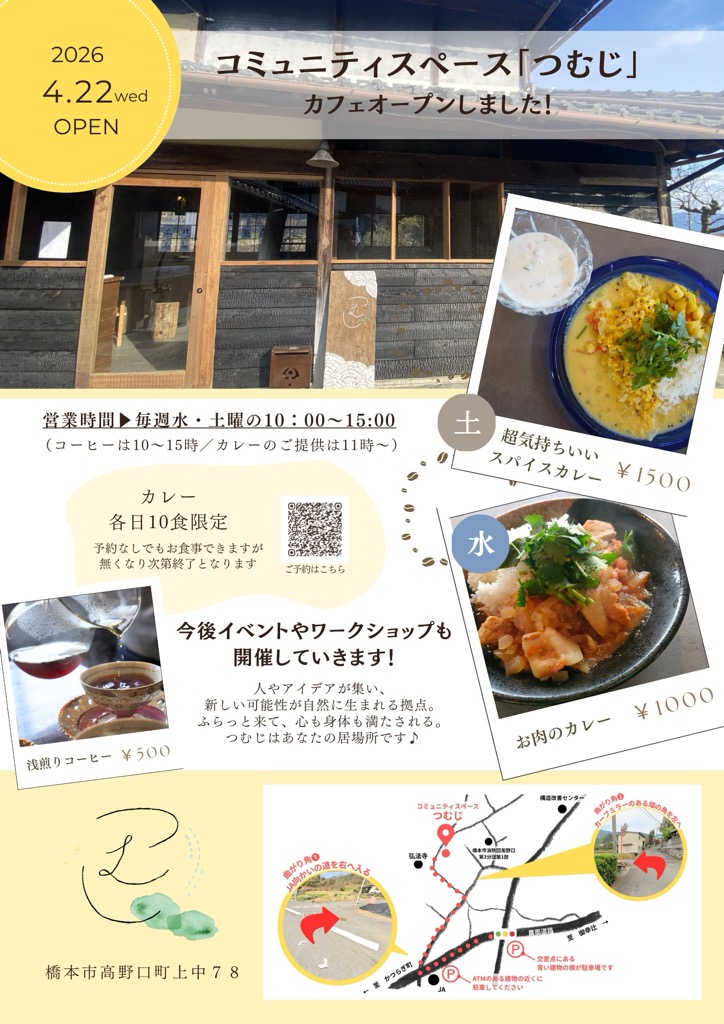 橋本市内の信太地区に、新たな交流スペースが生まれました。 「つむじ」と名付けられた、古民家を再生した施設です。 昨年度から、地域住民と全国からの有志による古民家再生プロジェクトが始まり、延べ200名以上の参加者を経て改修が行われ、2026年4月から運用が始まりました。 移住者の交流拠点やお試し住宅、ワークショップスペースなど様々な活用が予定されていますが… まずは、4月22日からカフェとしてオープンします!(水・土) 特徴的なコーヒーとハンドドリップコーヒーが楽しめます。