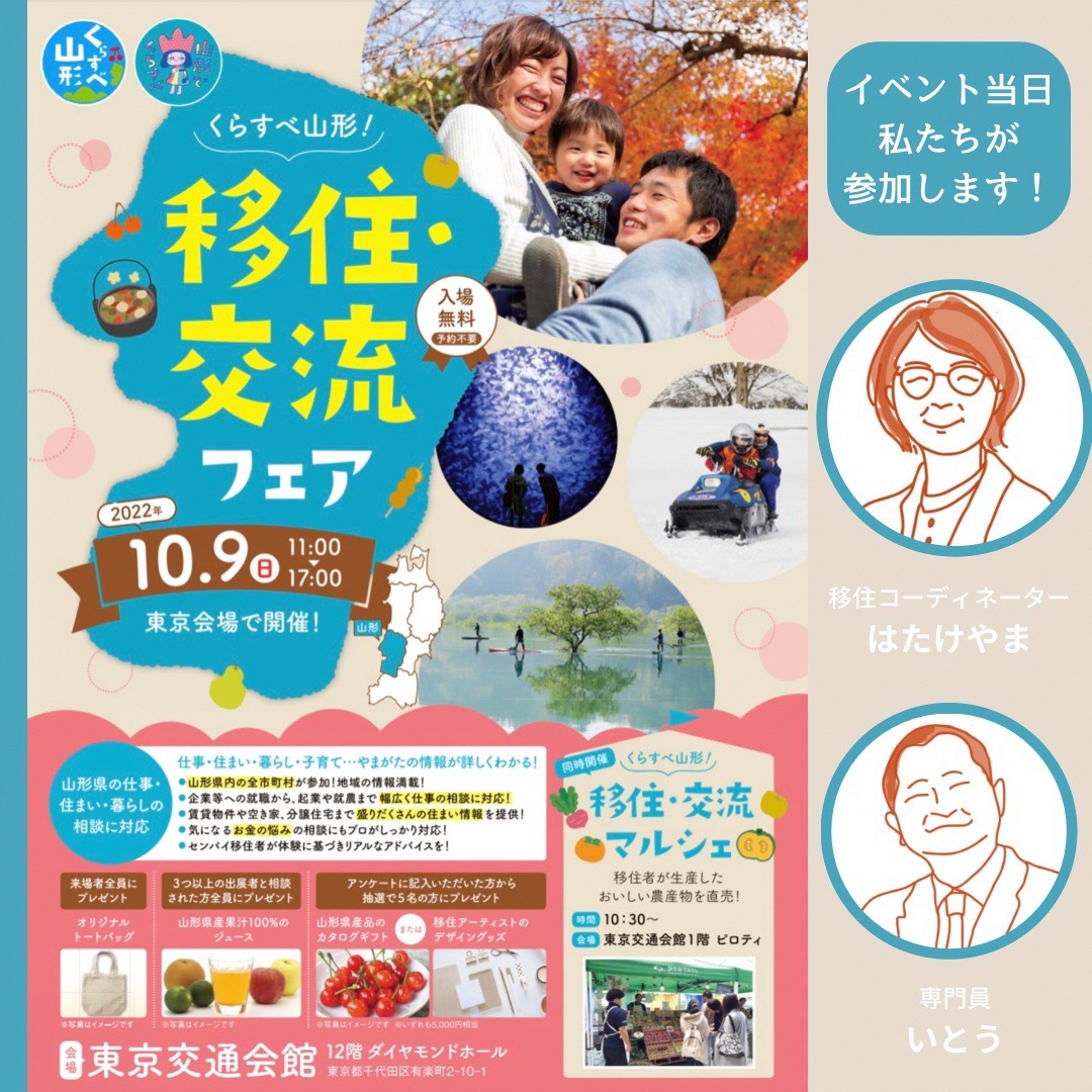山形県の市町村、仕事や住まいのサポート機関が参加し、移住に関する疑問や悩みにお答えする大相談会を今年も開催します。 鶴岡市も出展し、気になる住み心地や利便性、支援制度などさまざまなご相談にお応えします!鶴岡市のブースでは、専門員のイトウと移住コーディネーターのハタケヤマが参加します。 同日開催\くらすべ山形!移住・交流マルシェ/ 今年は、山形県に移住して就農された皆さんが自ら収穫した農産物【米、そば・うどん、野菜、イタリア野菜、果物、キノコ、ジュースなど】を東京交通会館1階ピロティにて試作販売いたします。 山形の“美味しい農産物”をご堪能ください! 【日時】 令和4年10月9日(日) 11時~17時 【フェア内容】 ●移住相談ブース ・県内35市町村 ・仕事や住まい、暮らしに関するサポート機関 ・先輩移住者 ●市町村ご当地自慢! プレゼンテーション ●先輩移住者相談コーナー (東京出展) 来場者プレゼント ★来場者全員にプレゼント! ・オリジナルトートバッグ ★3つ以上の出展者と相談された方全員にプレゼント! ・山形県産果汁100%のジュース ★アンケートに記入いただいた方から抽選で5名の方にプレゼント! ・山形県産品のカタログギフト または ・移住アーティストのデザイングッズ (いずれも5,000円相当) 会場 ●移住フェア 東京交通会館 12階ダイヤモンドホール ●農産物マルシェ】東京交通会館 1階ピロティ 東京都千代田区有楽町2-10-11 出展団体 ■市町村/東京出展 山形市/米沢市/鶴岡市/酒田市/新庄市/寒河江市/上山市/村山市/長井市/天童市/東根市/尾花沢市/南陽市/山辺町/河北町/西川町/朝日町/大江町/大石田町/金山町/最上町/舟形町/真室川町/大蔵村/鮭川村/戸沢村/川西町/小国町/白鷹町(町ふるさと移住推進協議会)/飯豊町/庄内町/遊佐町 ■市町村/オンライン出展 中山町、高畠町、三川町 ■団体/東京出展 山形県Uターン情報センター/ショウナイズカン(ヤマガタデザイン株式会社)/やまがたチャレンジ創業応援センター/公益財団法人やまがた農業支援センター/山形県林業労働力確保支援センター/山形県県土整備部/公益社団法人全日本不動産協会山形県本部/山形県すまい・まちづくり公社/山形県しあわせ子育て応援部 ■団体/オンライン出展 山形労働局/社会福祉法人山形県社会福祉協議会山形県福祉人材センター/公益社団法人山形県看護協会山形県ナースセンター/山形県漁業就業者確保育成センター/公益社団法人山形県宅地建物取引業協会/株式会社山形銀行