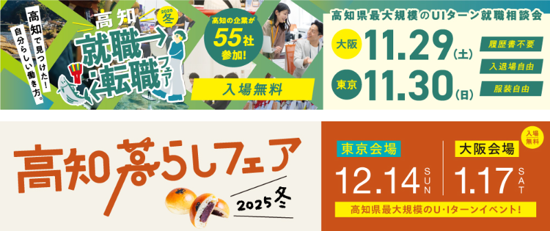 高知県では、 ●ご希望の暮らしができる地域のご紹介 ●夢を実現するための働き方のご提案 ●高知県の自然・文化・食・人といった魅力が分かるイベントの開催 をしています。 このページではその中でも「特におススメな情報」をご紹介します! ご覧いただいて少しでも『気になる!』という方は当ページ下部の「くわしい話を聞きたい」からお問い合わせいただければ、もっと詳しくご案内いたします! ---------東京・大阪で開催のビッグイベント!----------- ●高知就職・転職フェア2025冬 高知県最大規模のUIターン就職相談会を開催! たった1日で様々な高知県の企業に出会えるチャンス! 参加無料・入退場自由なので、高知出身の方や高知県への移住を検討されている方、U・Iターンを検討されている方はぜひお気軽にお越しください♪ 📍11/29(土) 大阪会場@難波御堂筋ホール ホール7 📍11/30(日) 東京会場@東京交通会館12F カトレアサロン ✅特設サイト:https://kochi-iju.jp/lp/kochi-job/realfair/ ●高知暮らしフェア2025冬 県内全市町村や就業分野などが出展する、高知県移住コンシェルジュ最大のU・Iターン相談会! 高知での暮らしや仕事、住まい、教育など、あらゆる情報が揃っています。 セミナーやワークショップなどの、楽しみながら参加できるコンテンツも盛りだくさん! ここでの出会いが、あなたの転機となるかもしれません。 📍12/14(日) 東京会場@東京交通会館12F ダイヤモンドホール 📍1/17(土) 大阪会場@OMMビル2F Aホール ✅特設サイト:https://kochi-iju.jp/lp/kurashifair/2025w/