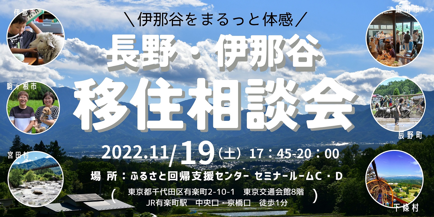 【日時】 11月29日(土) 午後5時45分から午後8時まで(予定) (午後5時30分から入場受付開始) 【申込方法】 参加には事前申込が必要です。 事前申込は下記申込フォームからお願いします。 【スケジュール】 17:30~ 受付開始 17:45~ 伊那谷・参加市町村のご紹介 18:00~ 移住者・担当者とテーマ別にフリートーク ★「子育て・教育」「仕事探し・地域おこし協力隊」「生活全般・冬の様子」 の3テーマに分かれてざっくばらんな座談会を行います。 申込の際に興味のあるテーマを2つ選択してください。 19:00~ 市町村との個別相談 ★市町村の移住担当者と個別の相談が可能です。 生活全般、仕事探しから空き家探しまで、お気軽にご相談ください。 20:00頃 閉会 注)参加人数によっては希望する市町村との相談ができない場合がございます。 その際は後日市町村担当者とのオンライン相談を別途調整させていただきます。