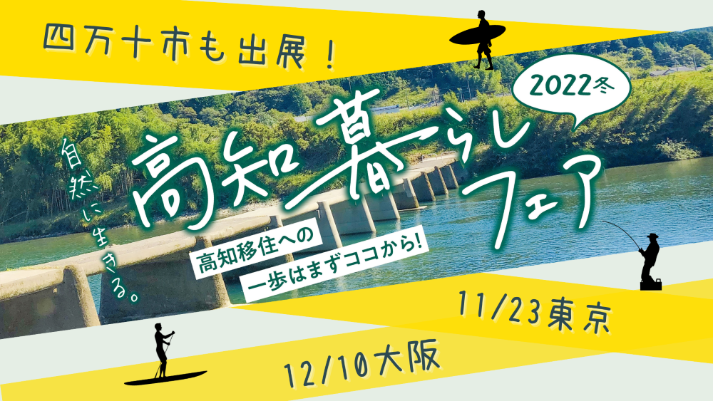 東京・大阪の会場でリアルで開催される『高知暮らしフェア』に四万十市も出展します。 四万十市に興味のある方、 観光やサーフィンで訪れたことがある方、 四万十市の出身だ!という方、 ざっくばらんにお話しましょう! ・山も海も川も街もある四万十市の魅力 ・四万十市に興味があるけどまだ行った事がない方向けの観光情報 ・四万十市ではどんな暮らしができるか移住の先輩の実体験 ・四万十市にはどんな仕事があるのかリアルな情報 ・四万十市に暮らす担当者と移住NPOスタッフ ・四万十市の空き家の実情 ・四万十市にもある高等技術学校って? などなど 移住にまつわることでしたら なんでもお話します。 当日ブースでお会いできることを楽しみにしております。