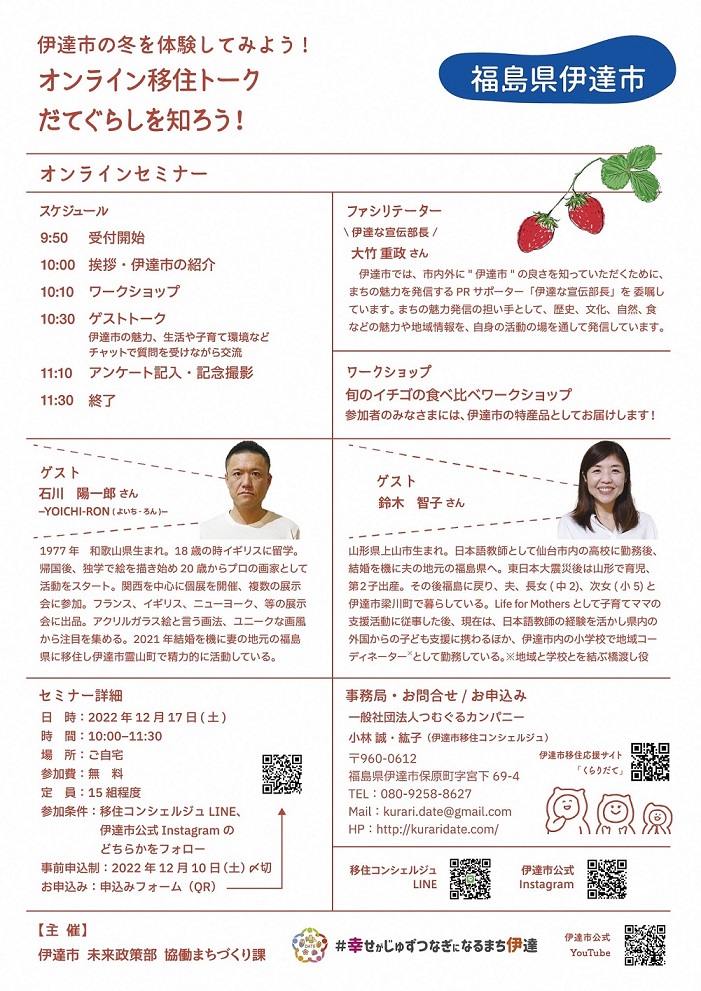 伊達市を知ってもうらうためのオンラインセミナーを下記のとおり開催します。 結婚を機に、配偶者の地元に移住された方2組をゲストにお迎えし、伊達市の暮らしをお話しいただきます。 自然豊かな場所で、子育てしたい!地方での暮らしってどんな感じ?など。 伊達市に興味を持たれている方、伊達市にUターンを検討されている方の参加をお待ちしてます。 当日の質問は、チャットで受け付けしますので、福島(伊達)の食の魅力、福島(伊達)での暮らしと遊び、地域との関わりや子育て環境など自由に聞いてください! 詳細は、伊達市移住定住サイトよりご確認ください。 https://www.city.fukushima-date.lg.jp/site/iju/57638.html