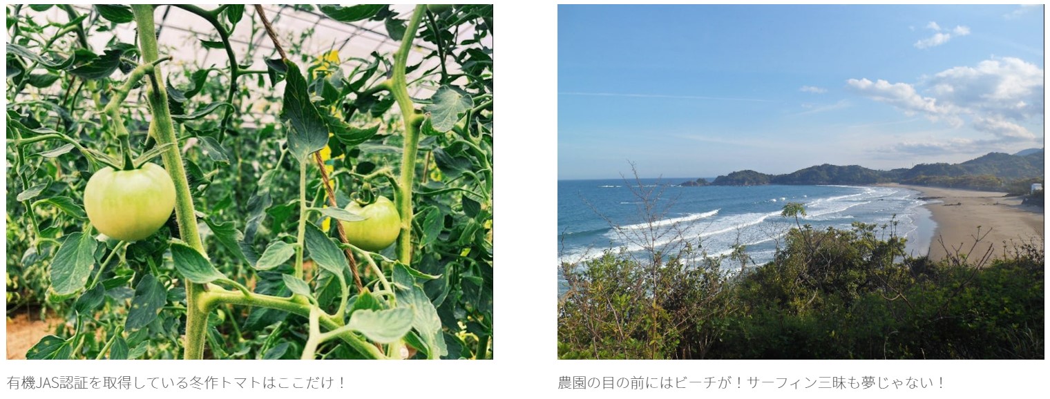 高知県移住促進・人材確保センターでは、高知県のUIターン就職・転職支援サイト「高知求人ネット」を運営しています! ーー 高知求人ネットとは ーー UIターンで「高知で働きたい」方に、高知の企業と求人情報を紹介しています。無料職業紹介への登録で、企業や求人とのマッチングを支援します。 今回は「高知求人ネット」に掲載中の、『Ikumiオーガニックトマトファーム』の農作業員の募集情報をご紹介します。 高知県の最東端に位置し、人口2,200人ほどの小さな町、東洋町。山と海に囲まれたこの町では、ポンカンを始めとした柑橘類の栽培や漁業が盛んです。また、日本随一のサーフスポット“生見サーフィンビーチ”があり、毎年全国各地から多くのサーファーや観光客が訪れる観光地でもあります。 そんなリゾート感溢れる東洋町生見にある『Ikumiオーガニックトマトファーム』代表の北岡さんは、神奈川県横浜市から移住し、2007年からトマト農家として就農。冬作のトマトで有機JAS認証を取得出来ている唯一の生産者です! ここ東洋町生見で有機JASトマトを一緒に育ててみませんか? ■日本でここだけ?!冬作の有機JASトマトを育てる! 化学肥料や農薬に頼らない有機農業によって一年中トマトを栽培しています。冬作トマトで有機JAS認証を取得している農園は日本でここ、『Ikumiオーガニックトマトファーム』だけ!将来的に農業で独立したい方も大歓迎!しっかり技術をお教えします! ■農家体験で農業・移住に関する不安を解消できる! 『Ikumiオーガニックトマトファーム』では農家体験を実施しています。農業はもちろん、東洋町の暮らしも体験できるので、移住後のイメージもきっと膨らむはず。ぜひ一度ご相談ください!また海外ボランティアも受け入れているため、タイミングが良ければ海外の方との交流も楽しめるかも♪ <農家体験概要> 朝昼晩食事付き(北岡さんの手作り!)/宿泊費無料/体験期間:7日~3ヶ月/就業時間6時間/※日当はありません。 ■プライベートもしっかり楽しむ! 育てるトマトは冬作の為、夏場は農閑期で、7月下旬~9月頭頃までは夏休みとなります(なんとは期間は約40日!!もちろん給与保証あり!)そして農園がある生見は、国内外から波乗りにやってくるサーファー達の聖地、“生見サーフィンビーチ”があり、毎年夏から秋にかけて多数のサーフィン大会も開催されるほど。夏休み中は、ビーチでサーフィン三昧も良し、日ごろの疲れを癒すべく海岸が眺めながらゆっくり過ごすのも良し…とプライベートもしっかり楽しめます! ■代表は「地域移住サポーター」 代表の北岡さんは、移住者と地域とのつなぎ役となる「地域移住サポーター」も務める心強い存在です!