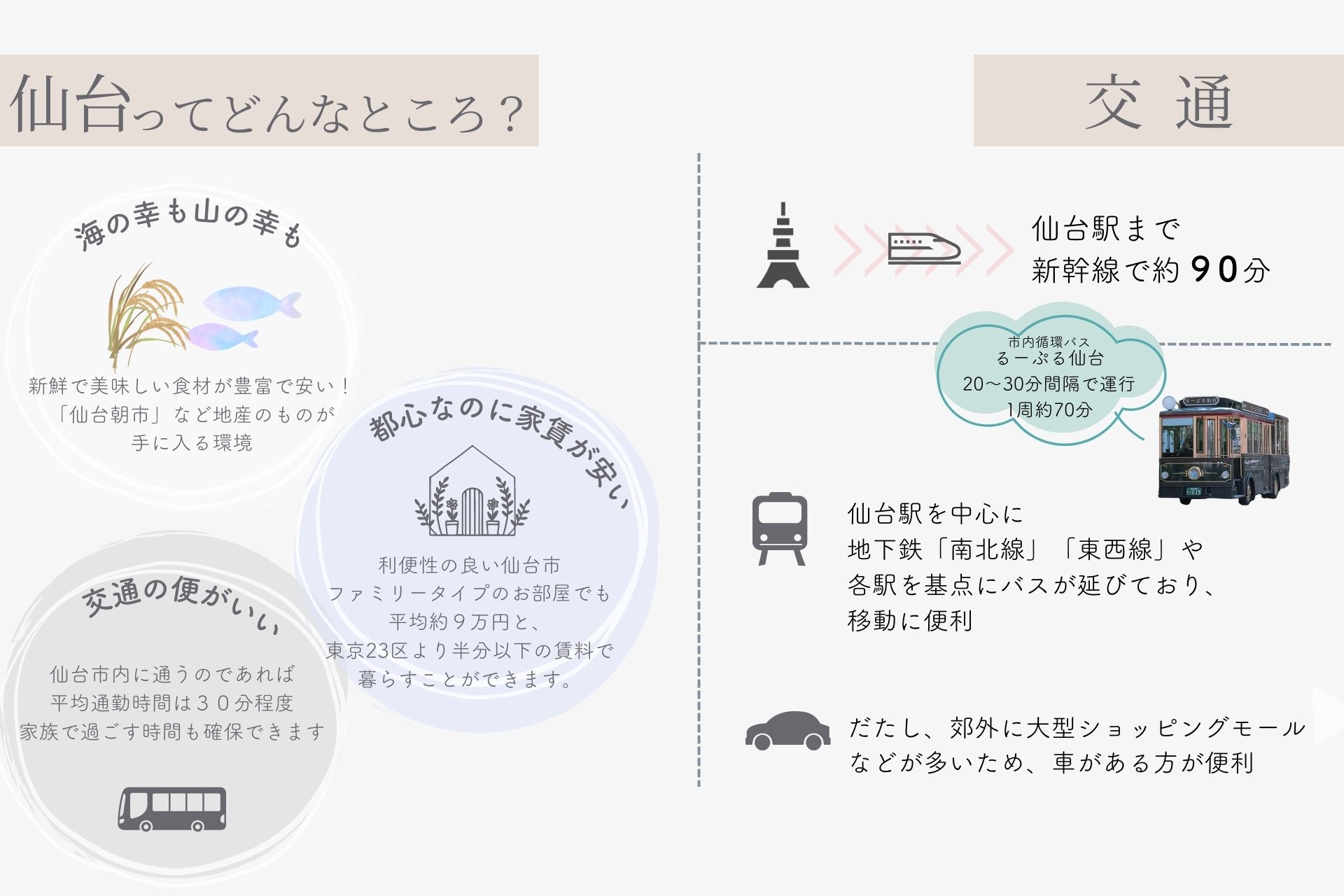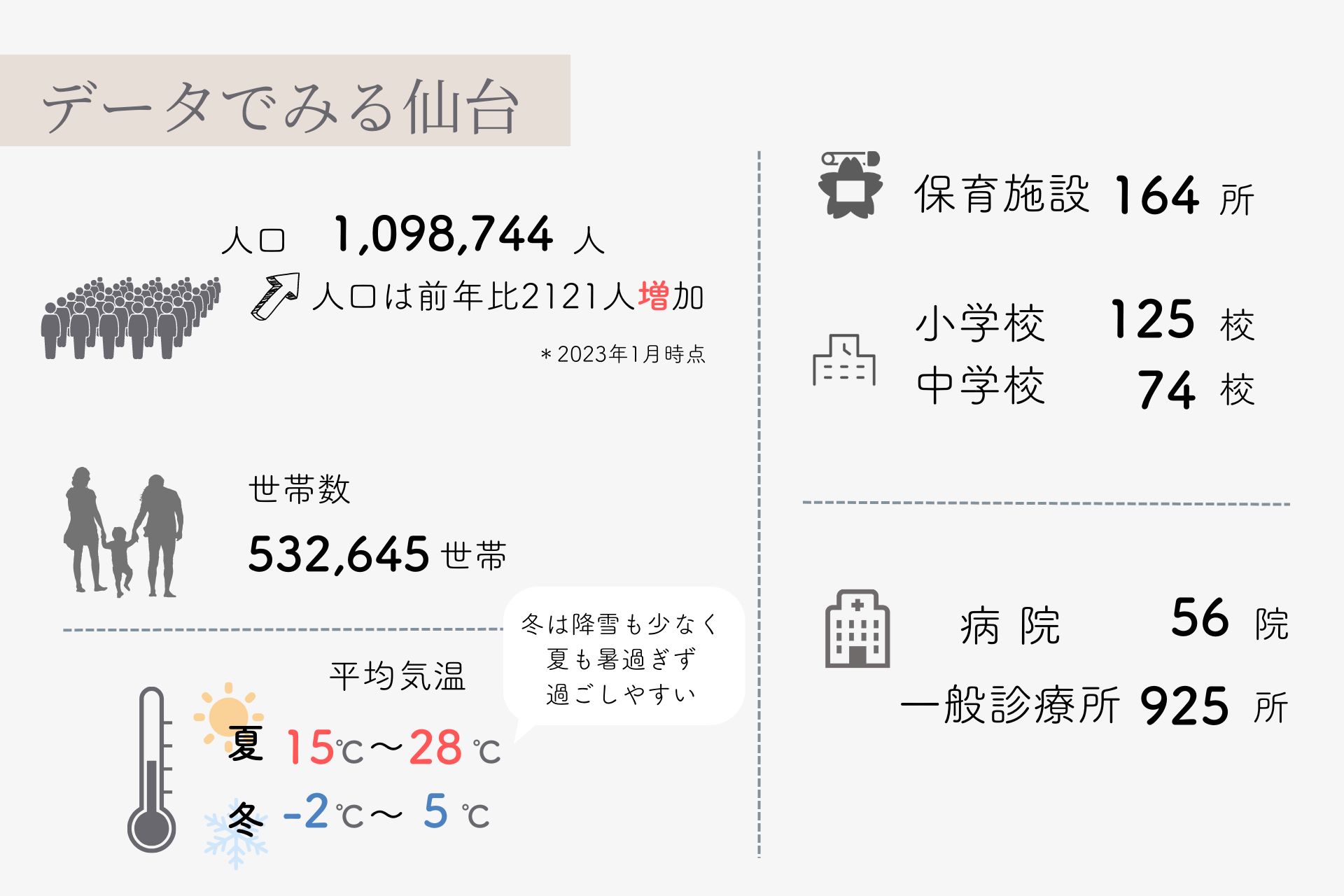 ■データでみる仙台市(2023年3月時点) ・人口:1,097,563人 / 世帯数:539,698世帯 ・平均気温:夏15℃~28℃、冬-2℃~5℃ 東北地方の中でも、仙台の冬は降雪も少なく、夏も暑すぎないので過ごしやすい気候です。 ・保育施設等:164所 / 小学校:125校 /中学校:74校 ・病院:56院 / 一般診療所:925所 ----------------- ■仙台市ってどんなところ? POINT1|交通の便がいい! 仙台市内に通うのであれば、平均通勤時間は約30分程度。 家族で過ごす時間も確保できそうですね。 POINT2|都心なのに家賃が安い! 利便性の良い仙台市で、ファミリータイプのお部屋でも平均約9万円と、東京23区より半分以下の賃料で暮らすことができます。 POINT3|海の幸も山の幸も、新鮮で美味しい食材が豊富に手に入る町 「仙台朝市」など新鮮な地のものを買うことができます。 ----------------- ■交通事情 ・東京から ― 新幹線で約90分 ・電車やバス ―仙台駅を中心に地下鉄やバスが延びており、移動に便利 地下鉄「東西線」「南北線」と、駅を基点に市内には豊富にバスが運行しています。 1周約70分で周れる市内循環バス「るーぷる仙台」はレトロでかわいいデザインのバスで観光でも人気です。 ・車 ― 郊外に大型ショッピングモールなどが多いため、車がある方が便利 隣接した市に行く際には必須 ----------------- ■市内の特徴 ▶青葉区エリア|市内で最も大きいエリア。 人口も市内の約30%の313,693人で最も多い。 オフィスや繁華街がある街の中心部。 東京と同様に市内中心部の移動であれば車より電車が便利です。 ▶泉区エリア|自然豊かなエリア。 南北線終点の泉中央駅周辺には多数のショッピングモールがあり、泉ヶ岳ではスキーや登山などアウトドアができるスポットがあります。 ▶太白区エリア|青葉区に次いで2番目に人口が多い、閑静な住宅街エリア。 ファミリー層は太白区に109,009世帯住んでおり仙台市全体の20%を占めています。 ショッピングモールなどが充実したのんびり暮らせるエリア 東西線終点の八木山動物公園駅には人気の遊園地「八木山ベニーランド」があり、太白区エリアには秋保温泉もあり休日のおでかけスポットとしても人気です。 ▶宮城野区エリア|仙台市の北部に位置し、子育て支援が充実したエリア。 特色のある教育施設や病院がたくさんあり、「三井アウトレットパーク」や「うみの杜水族館」もあります。 ▶若林区エリア|仙台市の南東部に位置し、 西側エリアは都市部、東側エリアは田園地帯に分かれています。 太平洋に面している「田園・海浜地域」は東日本大震災で甚大な津波被害を受けましたが、復興道路などの整備が進み、防災集団移転跡には新たな複合施設「アクアイグニス仙台」が建てられるなど期待の地域。